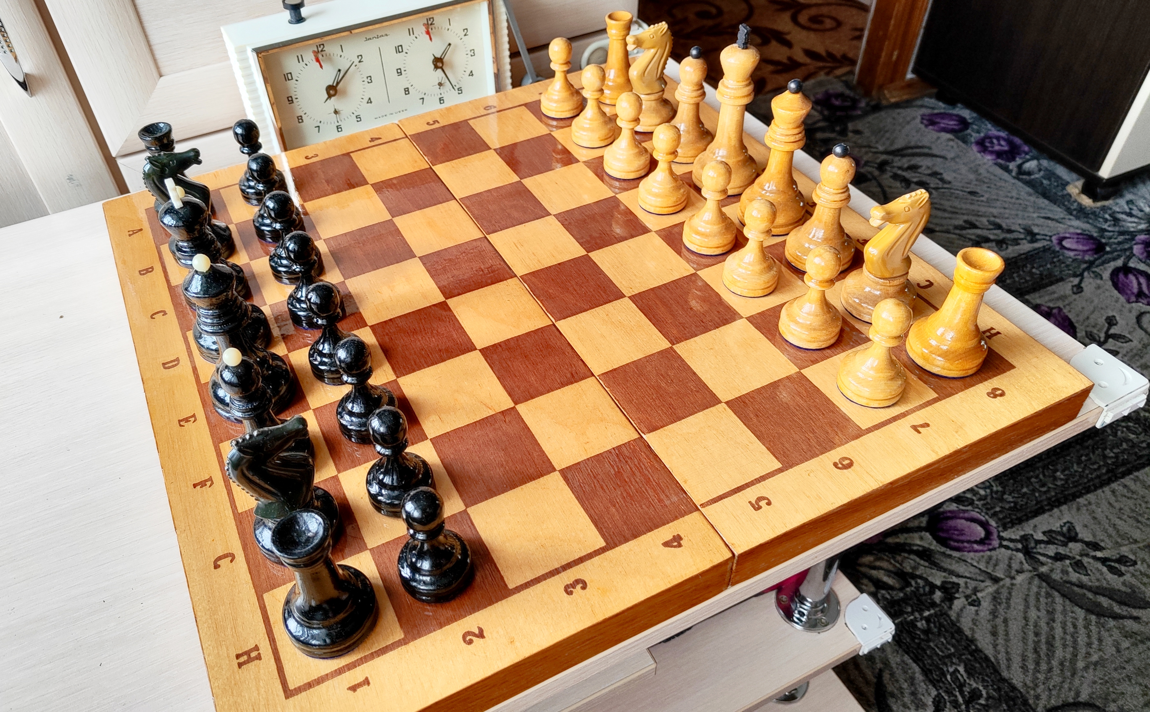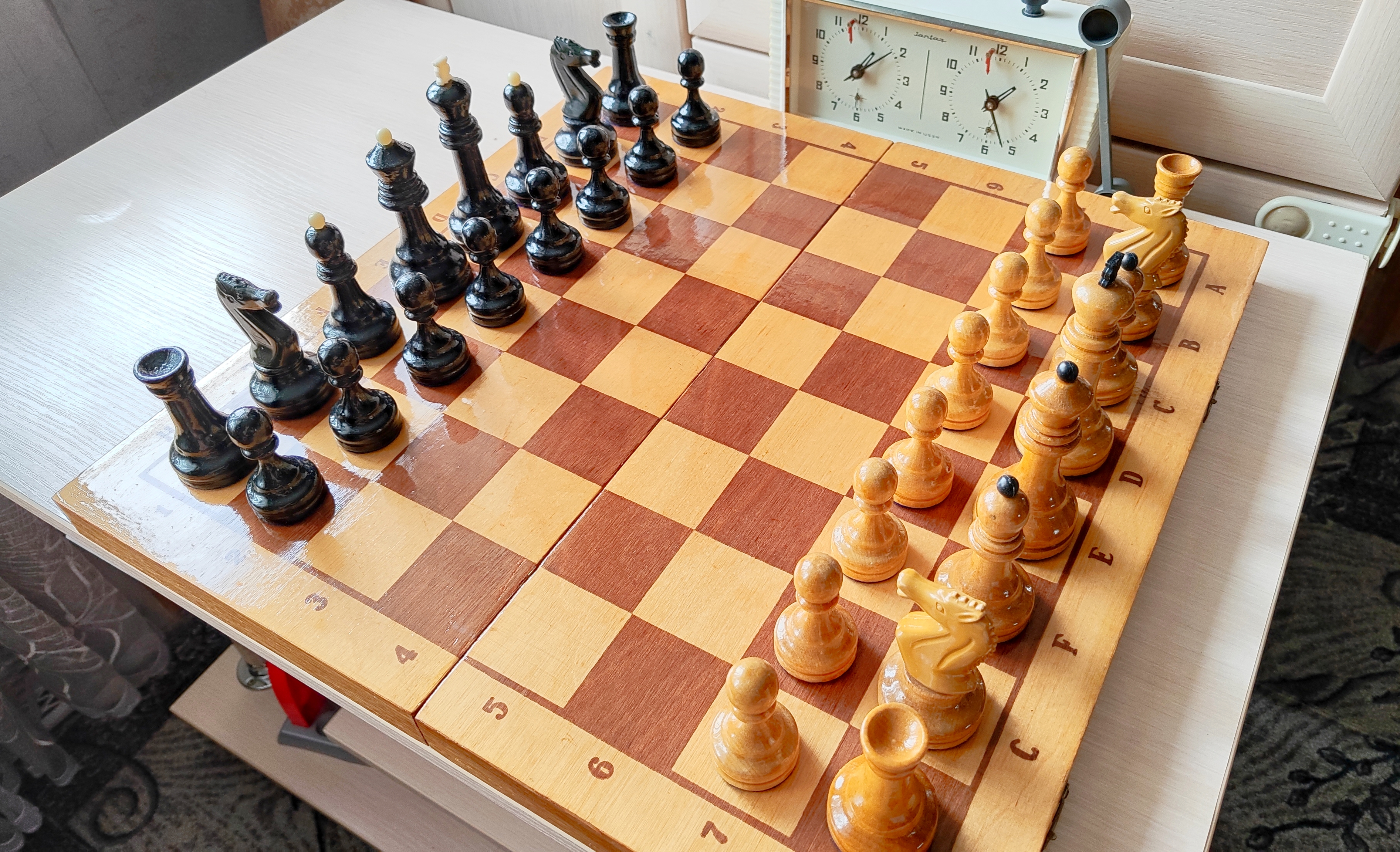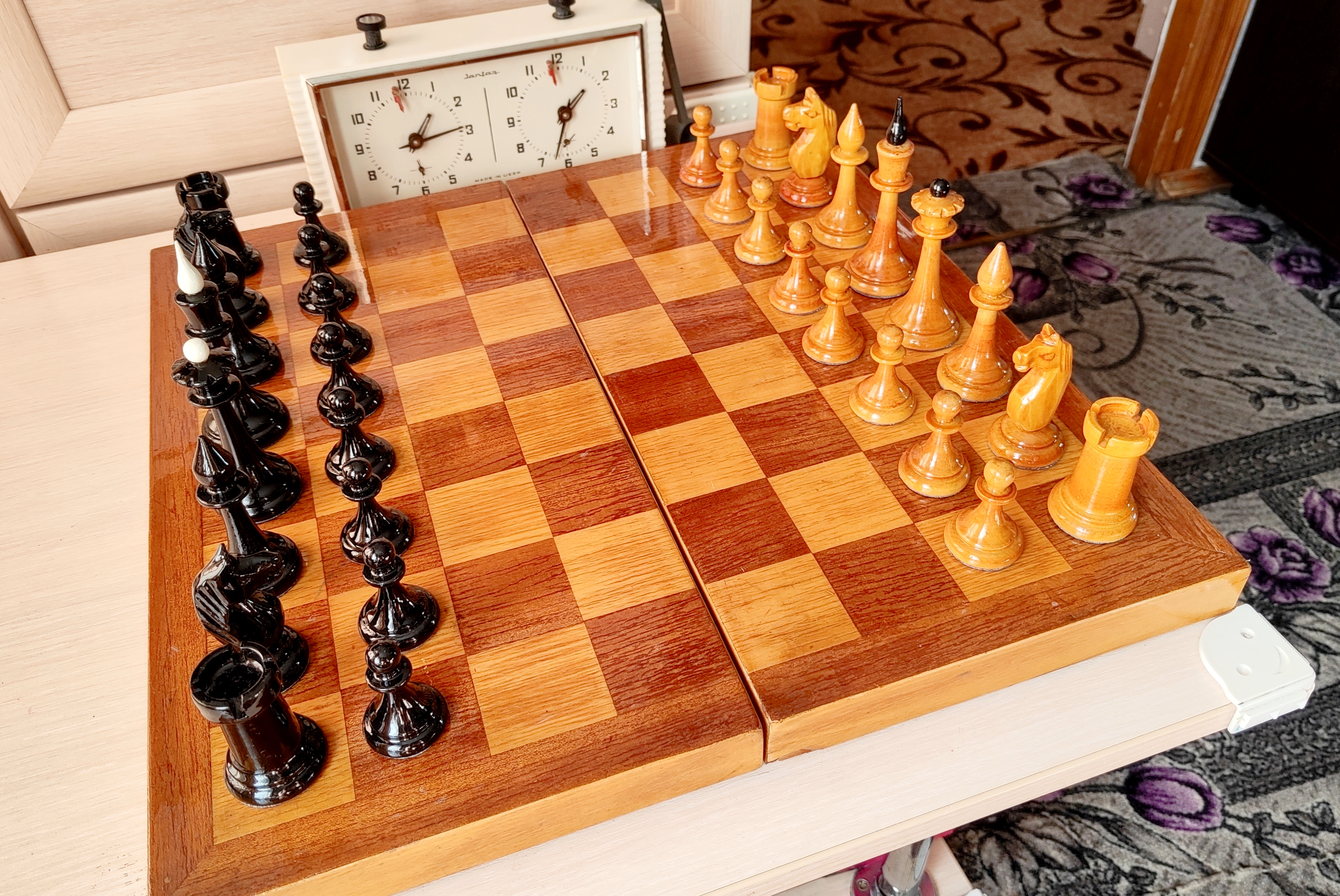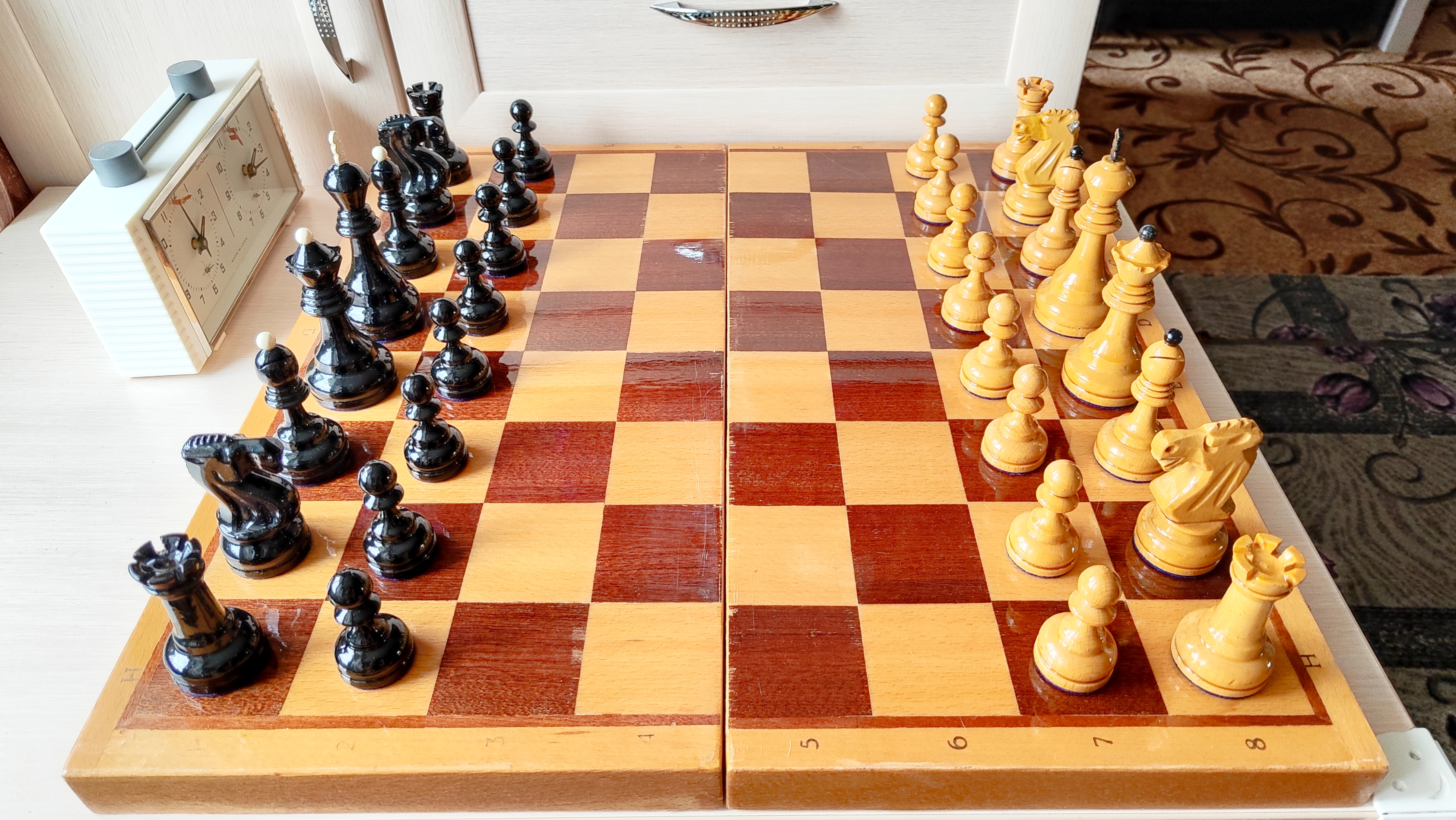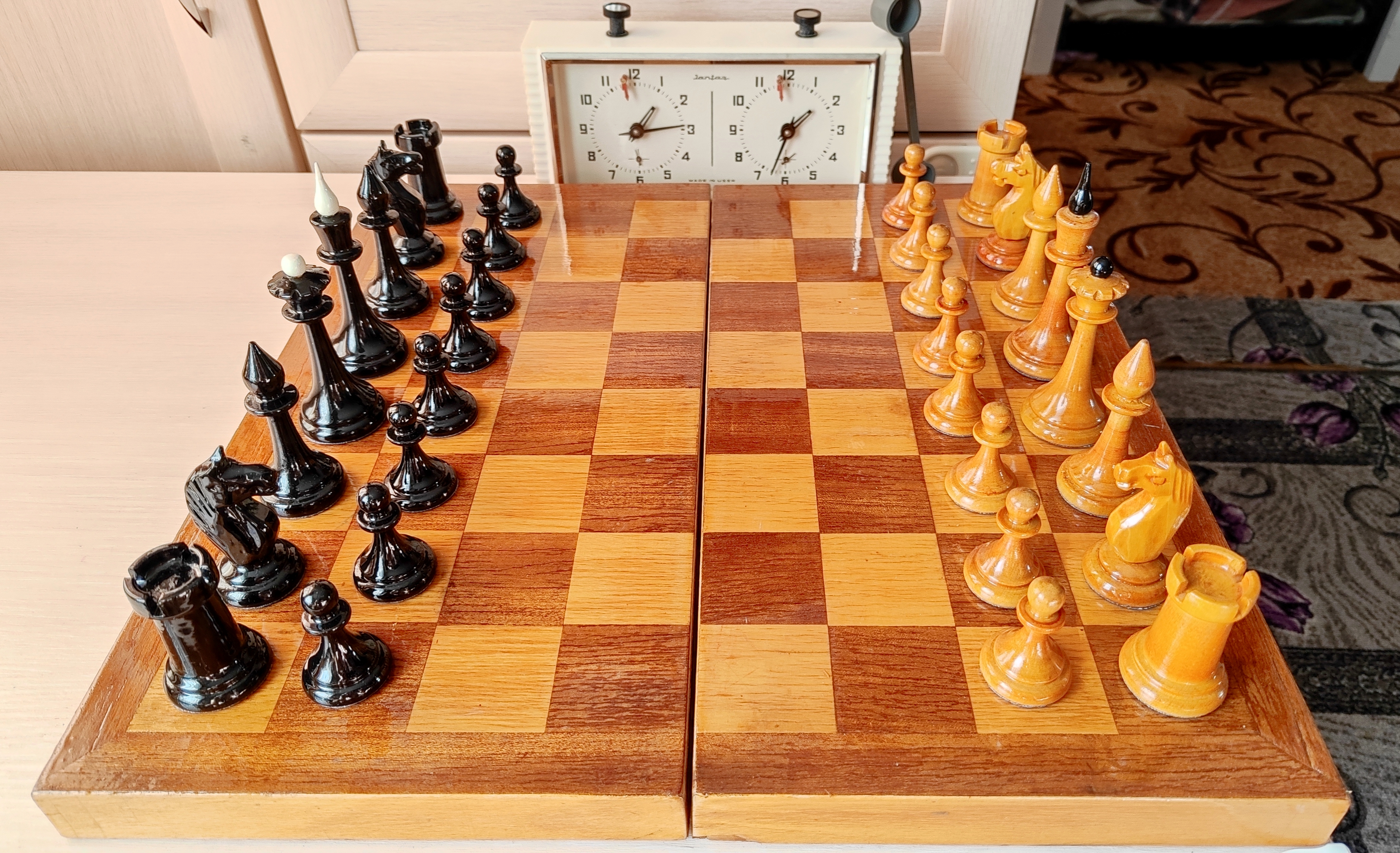 Самая последняя версия турнирных от этой фабрики и пожалуй, всего развалившегося СССР. Версия с т. н. тощими конями и максимально упрощенными фигурами в целом. Доска родная 45х45. Из работ только покрыл доску, подклеил утяжелители, заменил подложки на фетр 1.2 мм премиум. Оклеил саму доску изнутри - на последних фото, так делаю для защиты фигур внутри, в данном случае использован бежевый мебельный микровелюр. В целом, впечатление от комплекта неплохое, хоть и качество упало, а фигуры упростились. Внутри грузы очень тяжёлые (самые тяжёлые из всех попадавшихся мне версий турнирных), обеспечивают шикарную устойчивость и вес в руке - тяжесь это надёжно.