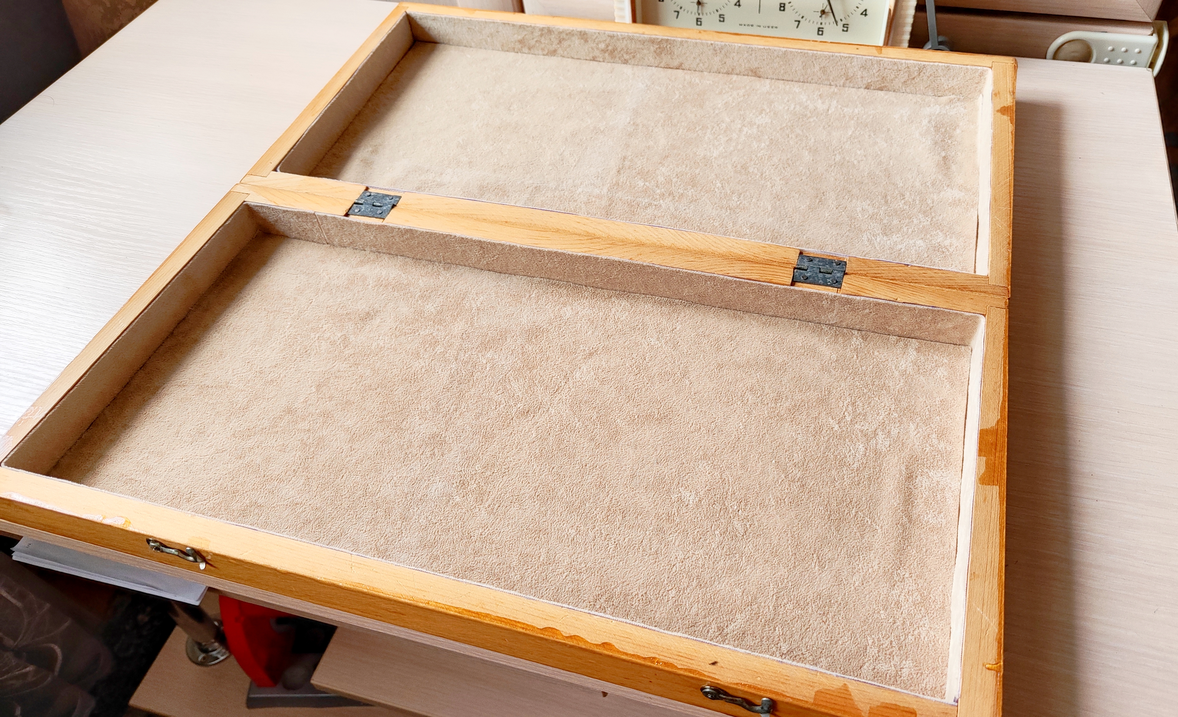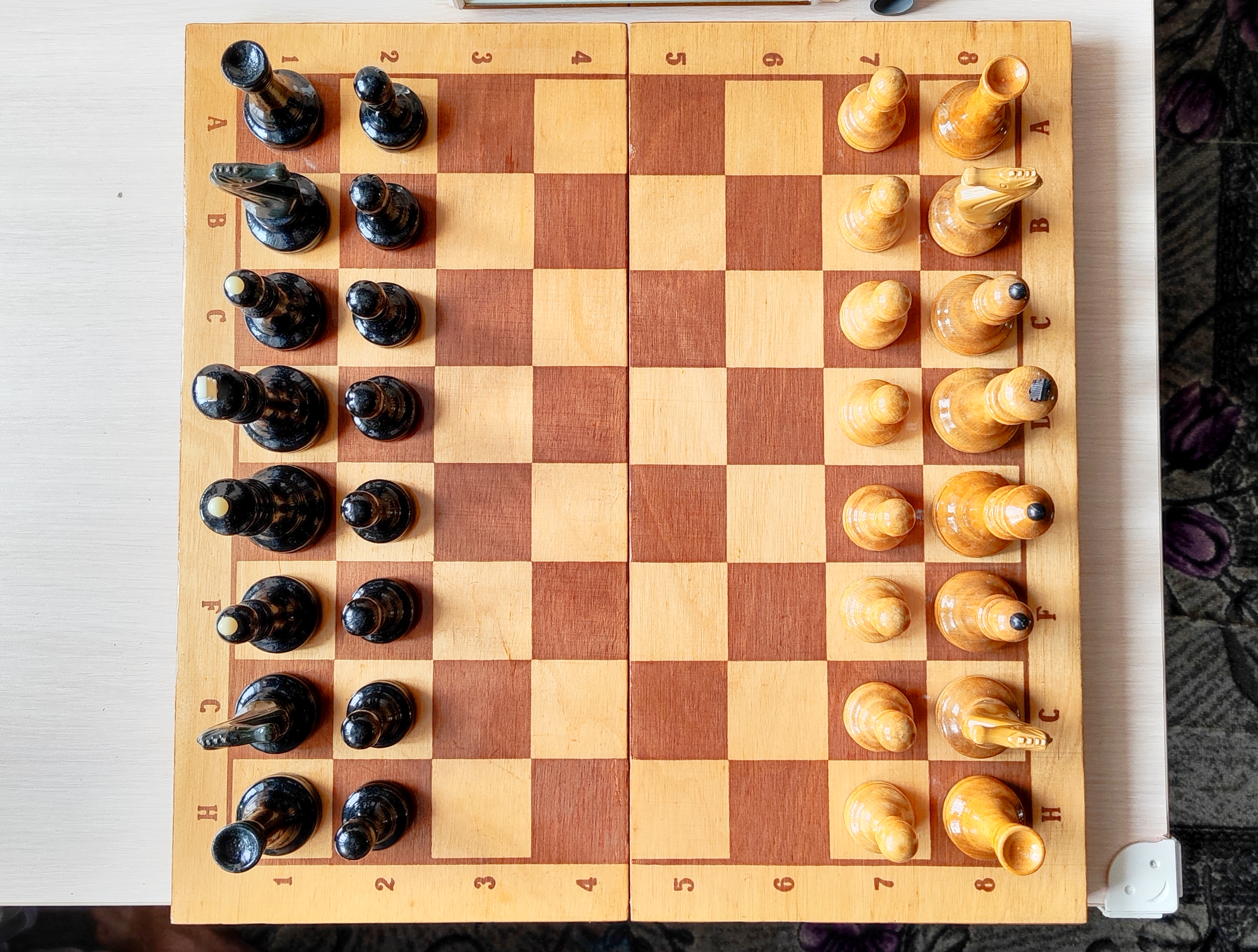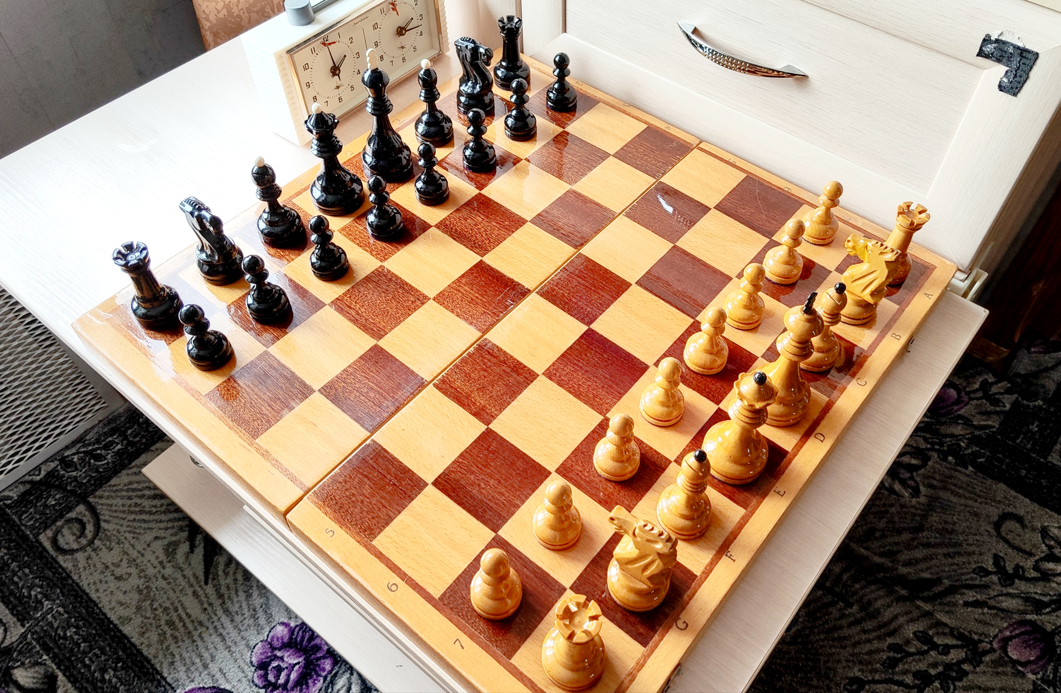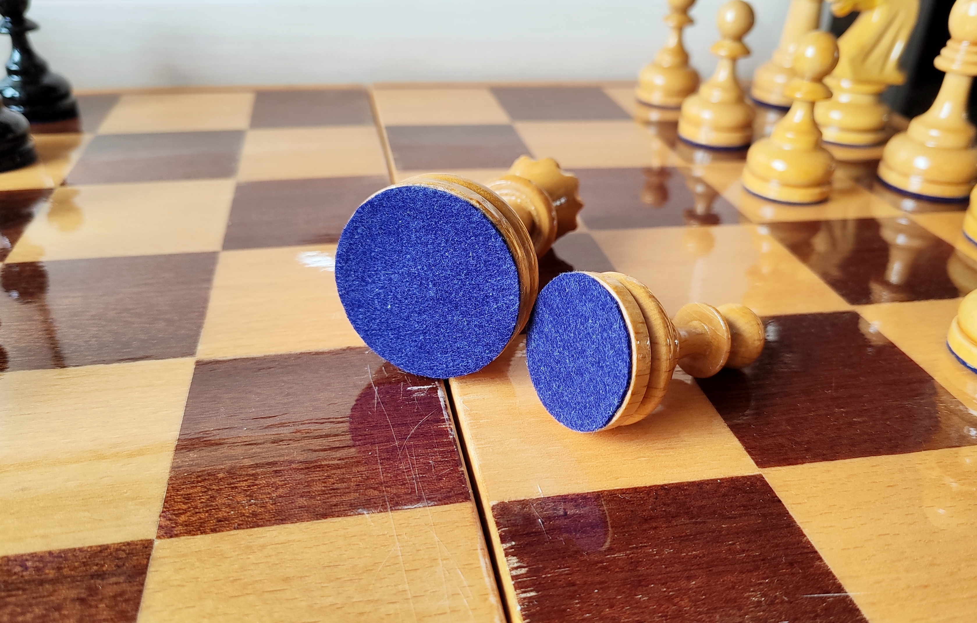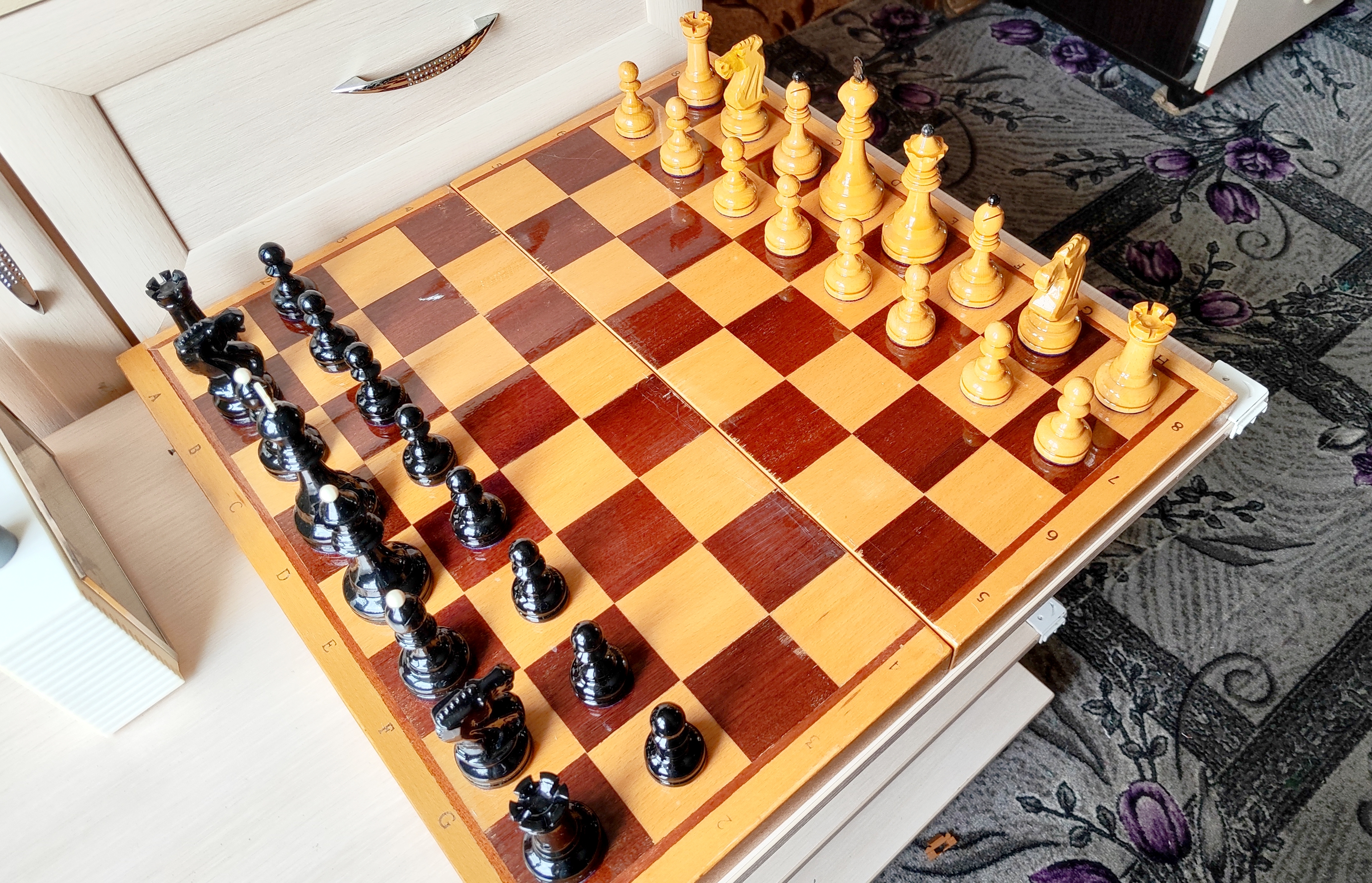 Самая последняя версия турнирных от этой фабрики и пожалуй, всего развалившегося СССР. Версия с т. н. тощими конями и максимально упрощенными фигурами в целом. Доска родная 45х45. Из работ только покрыл доску, подклеил утяжелители, заменил подложки на фетр 1.2 мм премиум. Оклеил саму доску изнутри - на последних фото, так делаю для защиты фигур внутри, в данном случае использован бежевый мебельный микровелюр. В целом, впечатление от комплекта неплохое, хоть и качество упало, а фигуры упростились. Внутри грузы очень тяжёлые (самые тяжёлые из всех попадавшихся мне версий турнирных), обеспечивают шикарную устойчивость и вес в руке - тяжесь это надёжно.