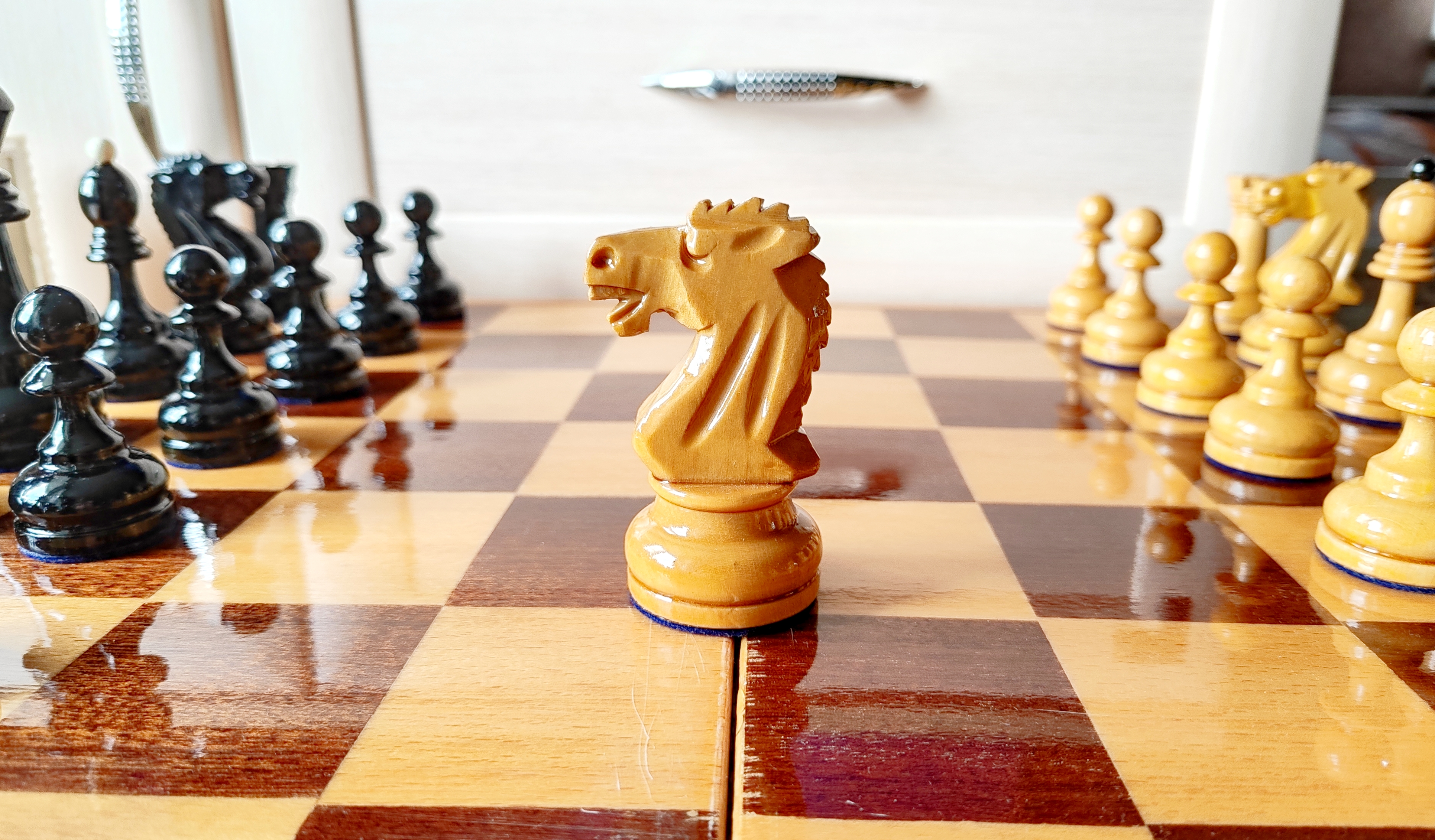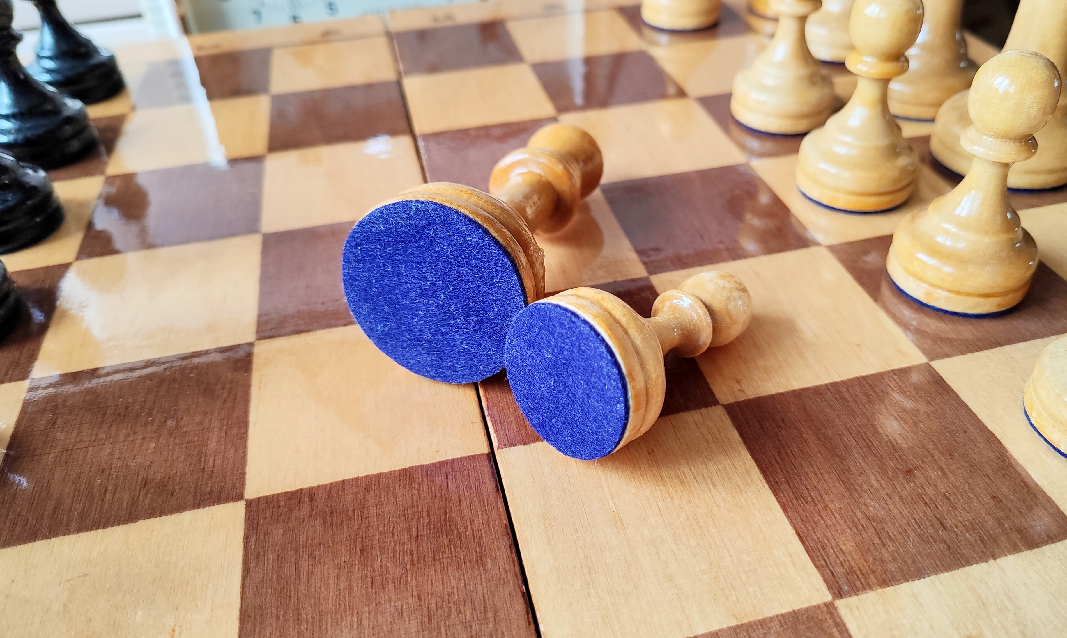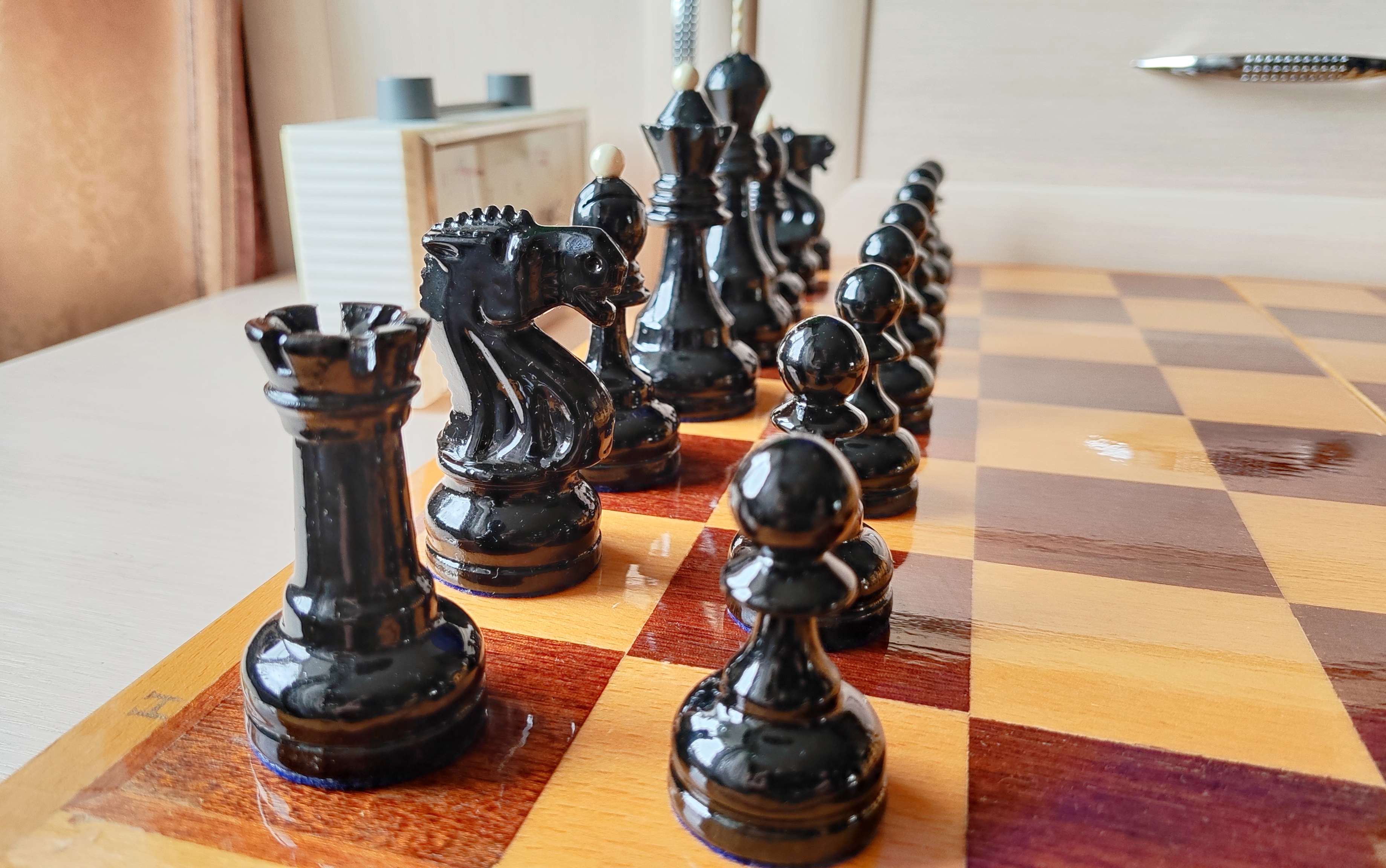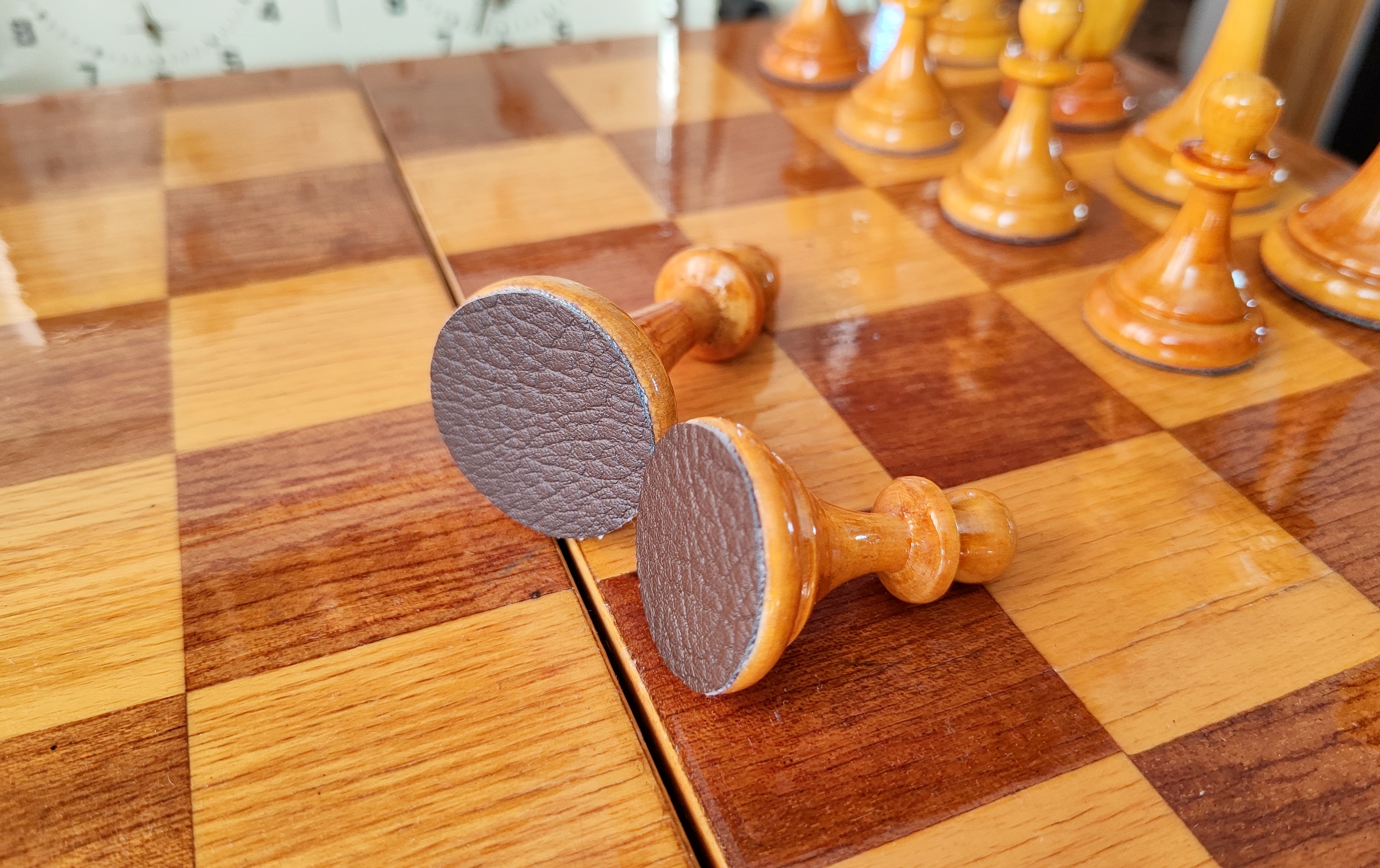 Из работ полная замена ЛКП, покрытие доски, подложки мебельный кожзам, ну и по мелочи ремонтные работы. На последнем фото пешка рядом с пешкой гроссов 2ВО, чтобы оценить миниатюрный размер малых Мордовских