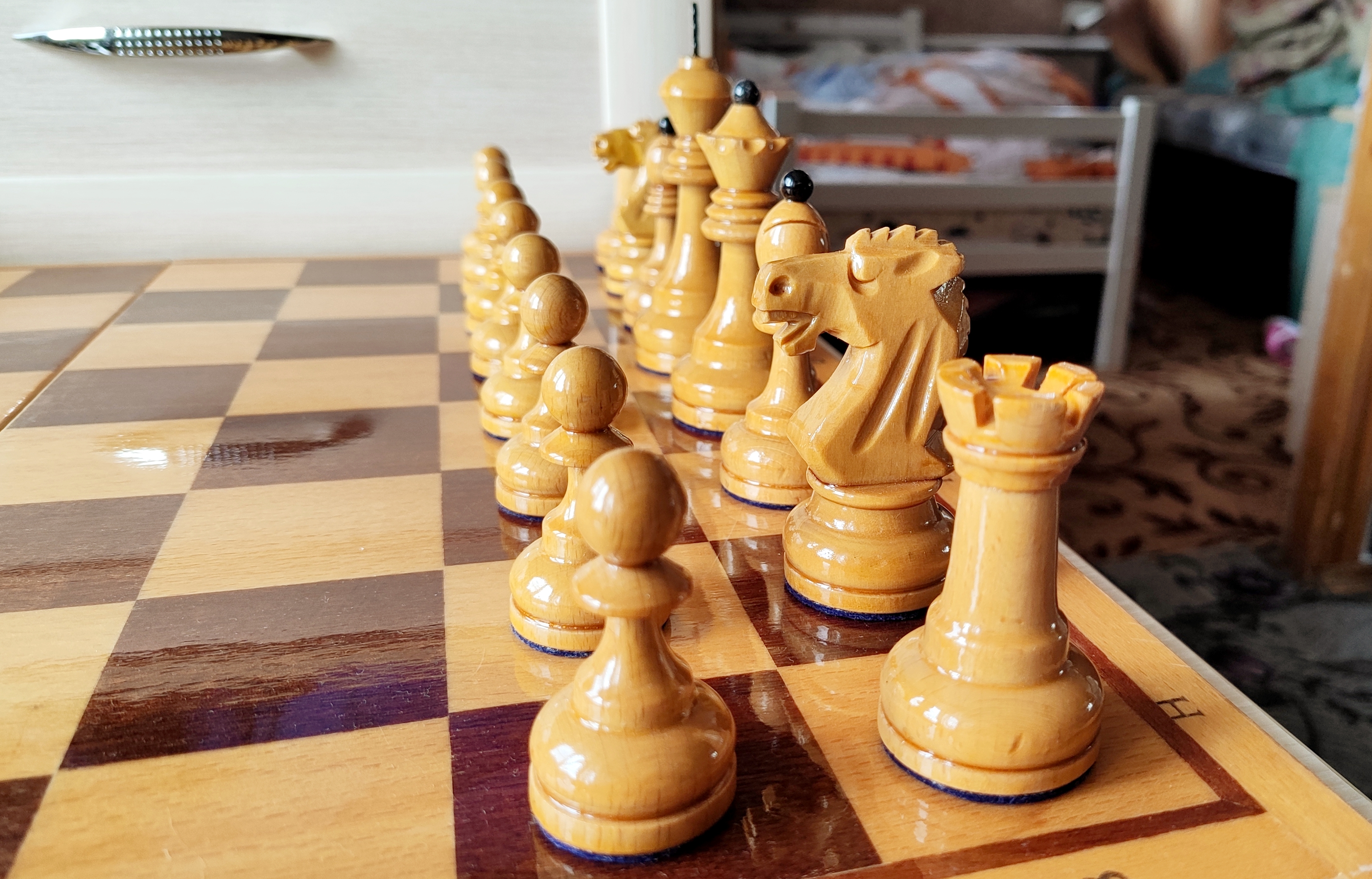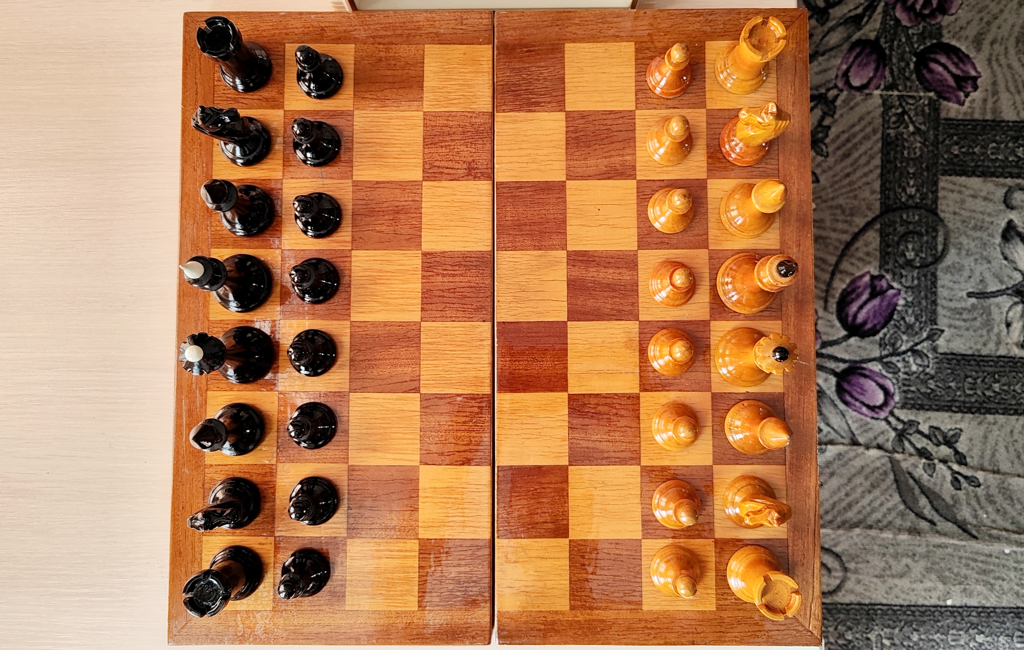 Наше прочее хобби2ВО турнирные. Генерация 70х годов. Резные светлые кони, фигуры с утяжелителями, подложки из синего фетра. Доска родная 45х45.