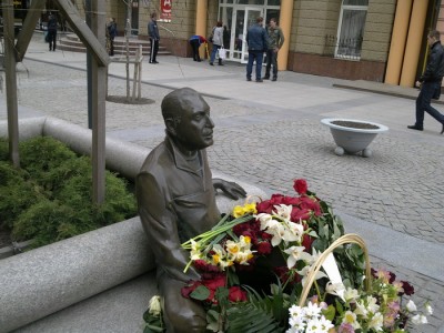 Это памятник Геннадию Аксельроду, он не один а два, его установили друзья, один при жизни, другой после смерти. Убийцы судя по всему не найдены. http://dnepr.comments.ua/news/2012/10/17/101337.html" onclick="window.open(this.href);return false;