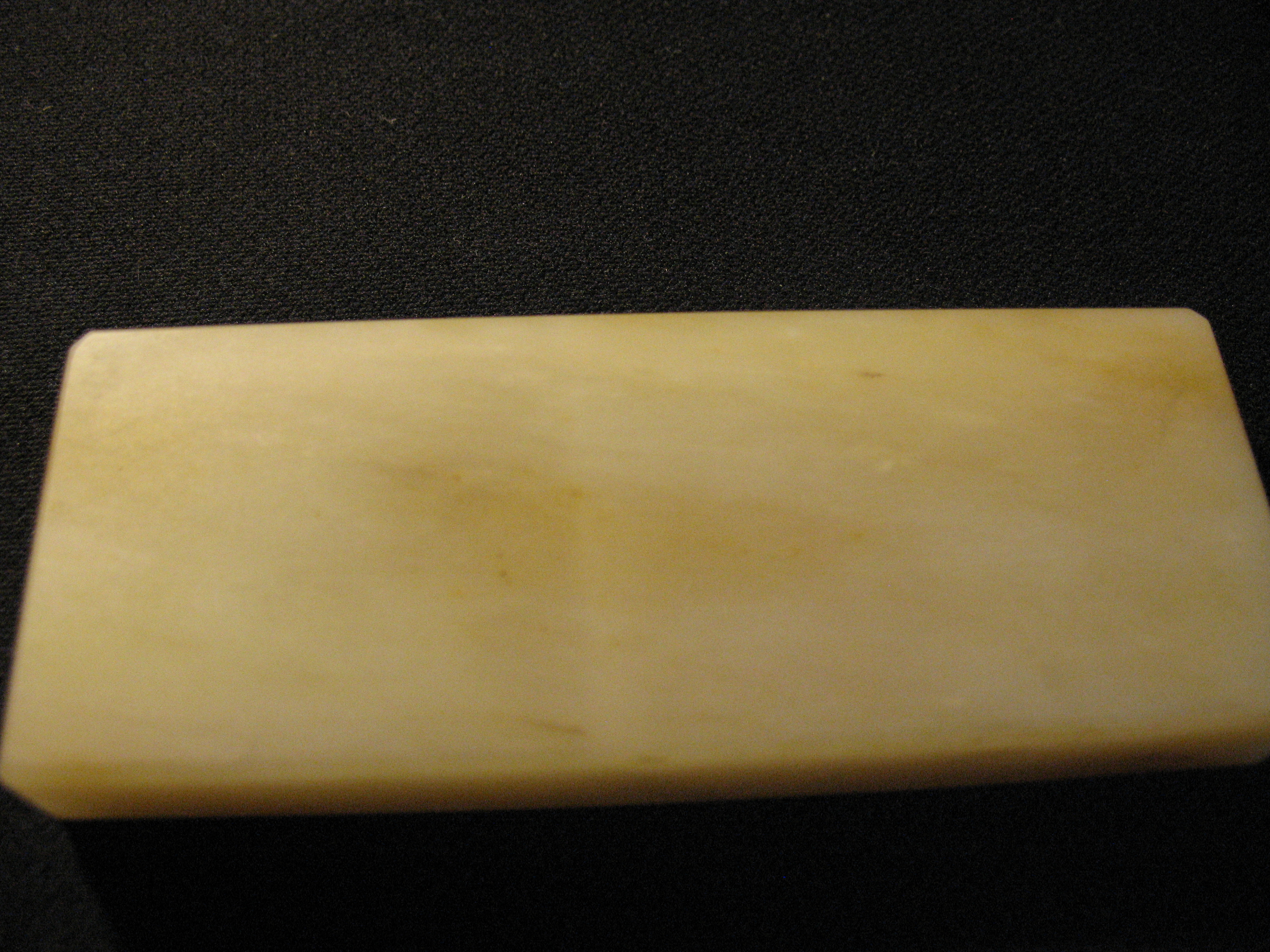 Так будем хоть при жизни разнолики! Помогите определить каменьЗдравствуйте. Приехал ко мне домик для любимой француженки. Кожа видимо испортилась и ее оторвали,так же в пенале вклеен камень (195х30х7) На вид был в масле, я его спиртом почистил. Подскажите пожалуйста, что это может быть за камень и как с ним работать.