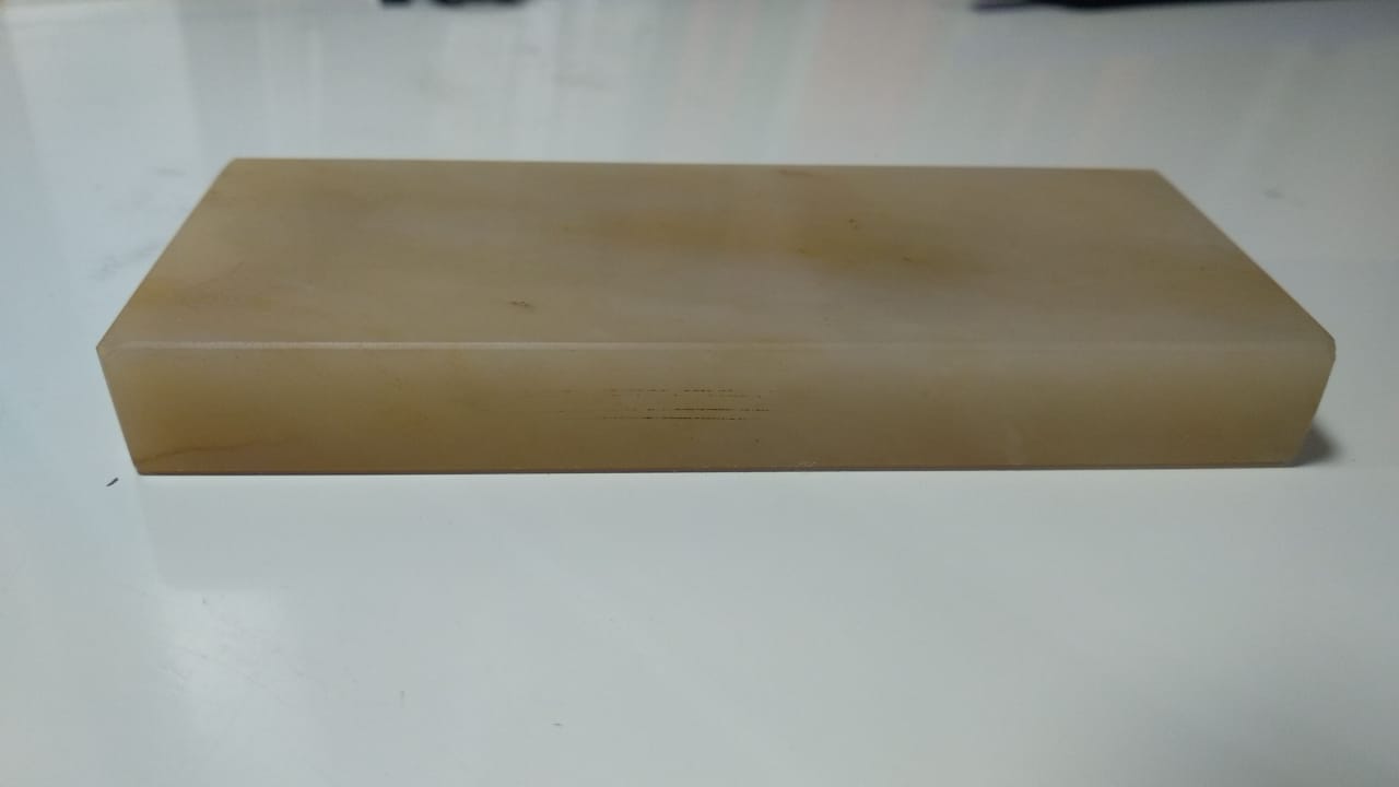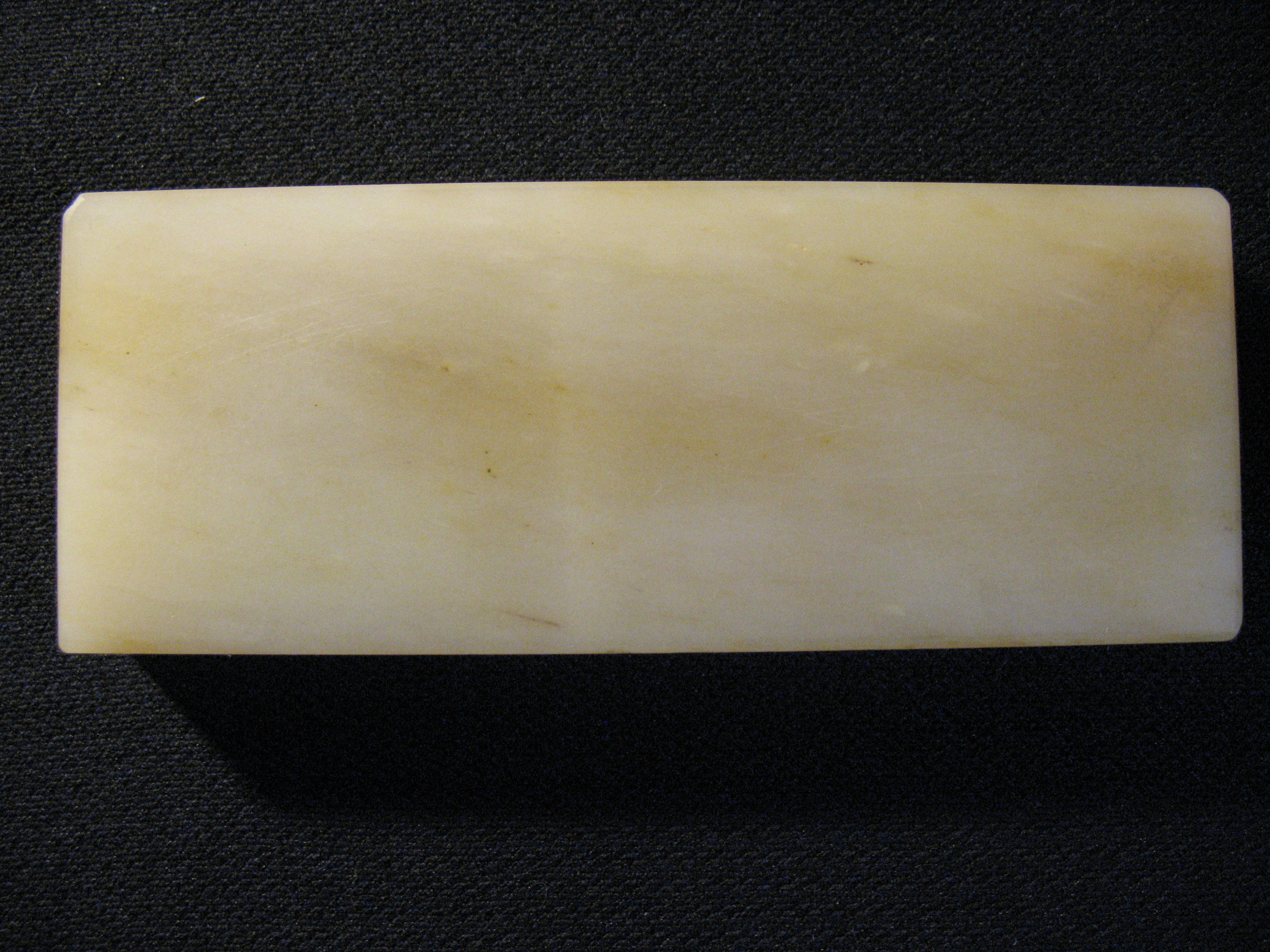 Так будем хоть при жизни разнолики! Помогите определить каменьЗдравствуйте. Приехал ко мне домик для любимой француженки. Кожа видимо испортилась и ее оторвали,так же в пенале вклеен камень (195х30х7) На вид был в масле, я его спиртом почистил. Подскажите пожалуйста, что это может быть за камень и как с ним работать.