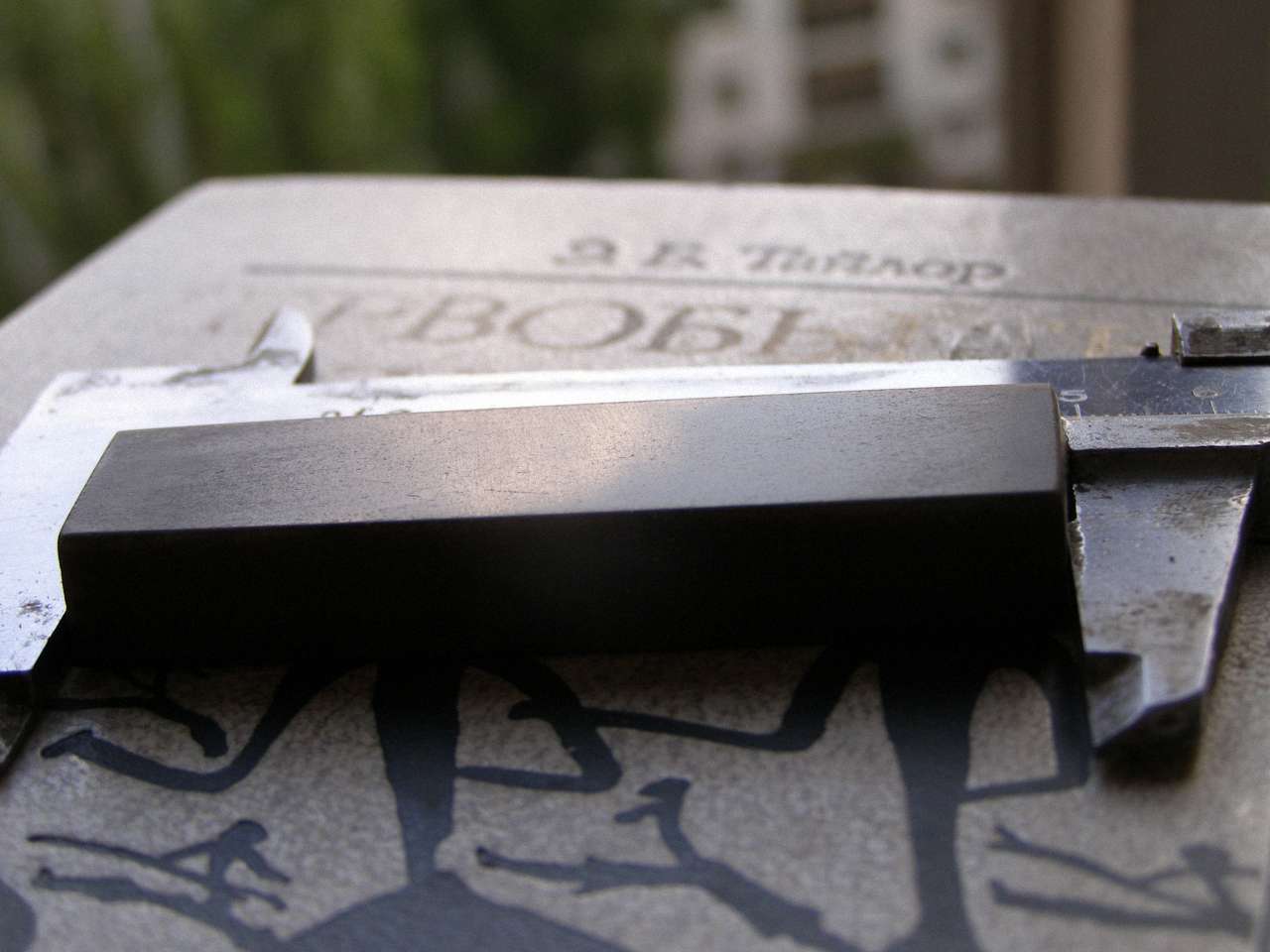 От пользования потемнел в цвет ржавчины (был темно-серым со следами туманного рисунка и слегка просвечивающийся), а от "знакомства" с твёрдыми (60+) сталями заполировался...
