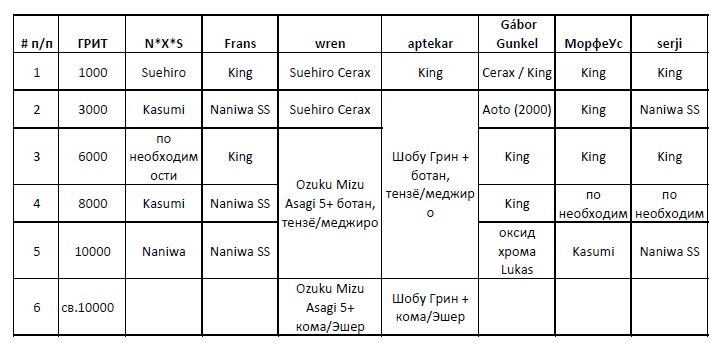 А таблица сия многим известна, её раньше mowersv составлял и корректировал. У меня сет камней, на чём сейчас и точу, как у Frans в этой таблице и разве это мешает мне спросить у знающих форумчан, что за "чудо" я приобрёл на местной барахолке у дедка, который в том числе торгует и бритвами...? А для подбора бритвенных камней тем тут много - хотя бы эта.. http://britva.ru/forum/viewtopic.php?f=52&t=4528" onclick="window.open(this.href);return false; Бесит, когда приходится пользоваться бритвой моложе себя...