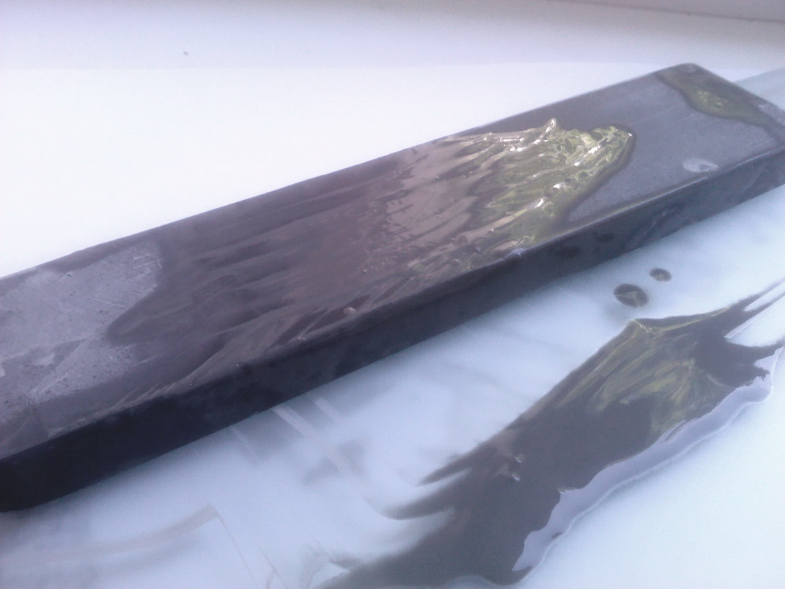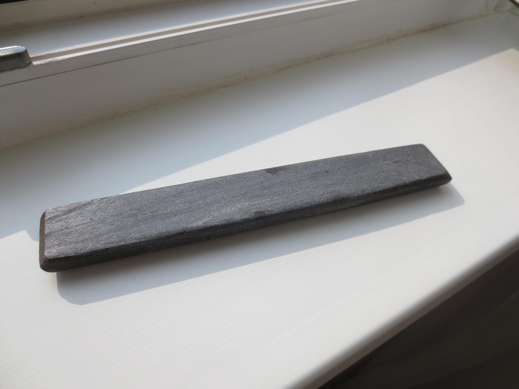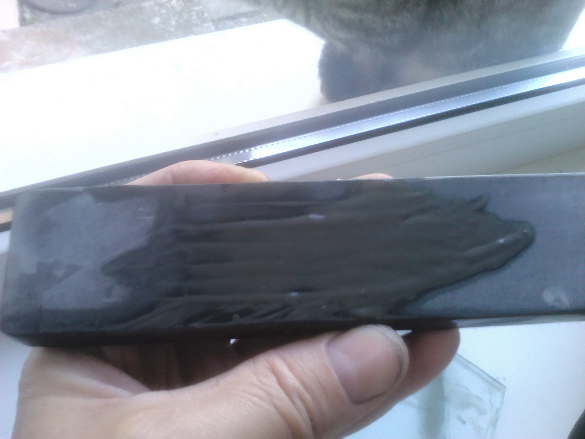 Re: Помогите определить каменьКупил на барахолке камень с полностью убитой геометрией, провалы по центры достигали 5-6 мм. После грубой доводке на наждаке и доводки на стекле получился брусок (на фото). При обработке на матовом стекле даже не понадобился порошок, образовалась черная густая пульпа, камень по ощущениям очень мягкий. В сухом состоянии он темно серый, а с маслом абсолютно черный как сажа. Я никогда не имел дело с oilstone, а это именно он и оказался. После капли масла, камень преобразился, у меня появилось мнение, что он доводочный. Короче, хочу узнать, что это за камень, у кого есть мнения на этот счет
