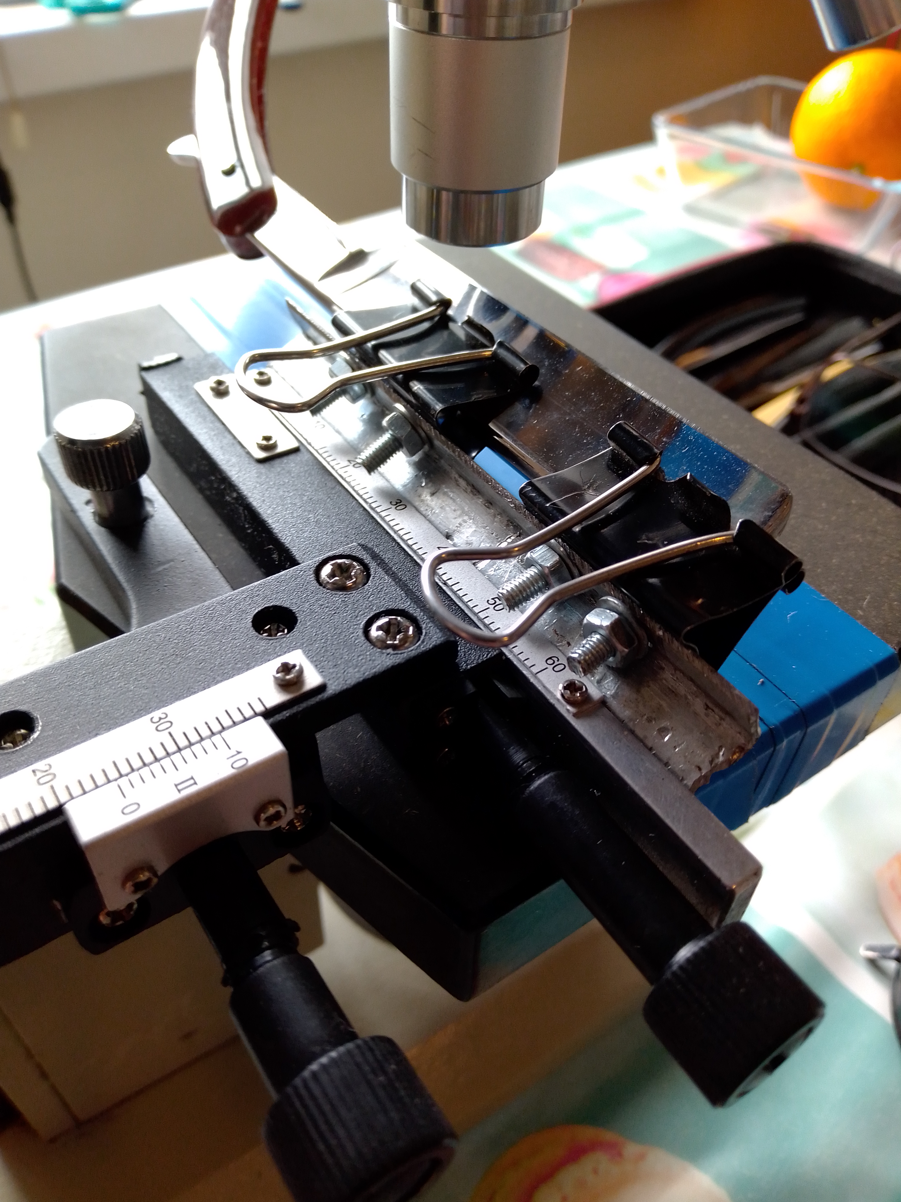 Оптика в помощь заточнику (лупы. микроскопы).Вполне достаточно, намного лучше, чем китайские 100х Оптика в помощь заточнику (лупы. микроскопы).Всем доброго дня. Поделюсь доработкой микроскопа - механической системой прокрутки, позволяющей комфортно рассматривать режущую кромку . В связи с дороговизной координатного столика нашего производства, на алиэкспресс был куплен координатный столик (поиск на Алиэксспрес по словам: Attachable Mechanical Stage X-Y). На котором были откручены держатели стекол. Вместо держателей прикрутил кронштейн из оцинковки с канцелярскими скрепами. Главное на кронштейне выгнуть правильно углы. В качестве информации окуляр использую х7. Объективы: в основном х8, в случае если нужно лучше присмотреться, то переключаюсь х10. Вполне хватает. У нас три времени года: грязь засохла, грязь намокла и грязь замерзла.