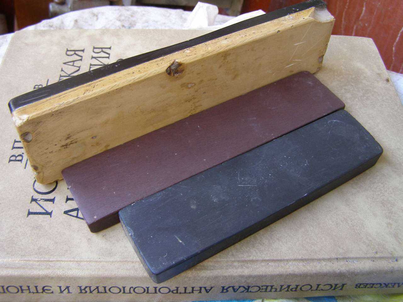 Re: Что за камень?Если не арканзас, то что ещё может быть? И как можно определить? -- Есть ещё несколько старых камушков с дюймовыми размерами. Вероятно ещё дореволюционные... С ними тоже хотелось бы разобраться. 1. Двусторонний черно-белый камень: 7 x 1 7/8 x 5/8 = 178 x 47,5 x 16 мм Черная сторона заметно более мягкая, черта - белая. Белая сторона более мелкозернистая и более твёрдая. Имеет неравномерный цвет слоновой кости - вероятно результат засаливания. 2. Вишнево-коричневый камень, опять с дюймовыми размерами: 6 x 1 3/4 x 3/8 = 152 x 35 x 9,5 мм Рабочие плоскости имеют тонкую свилеватую структуру, на ярком свету напоминающую перламутр. Явно водяной - весело даёт суспензию. Пару раз использовал в качестве нагуры на плотном электрокорунде М28. Понравилось. Да и всё равно ведь надо выравнивать? Черта - коричневая. Железистый сланец? 3. Черный камень. 5 1/4 x 1 3/4 x 1/2 = 134 x 35 x 13 мм Похож на черную сторону #1, но немного мягче - из этой тройки - самый мягкий. Черта - белая. На выкадровке - текстура вишнёвого. Остальные - однородные. Цинизм - это способ спокойно принимать жизнь такой, какая она есть.