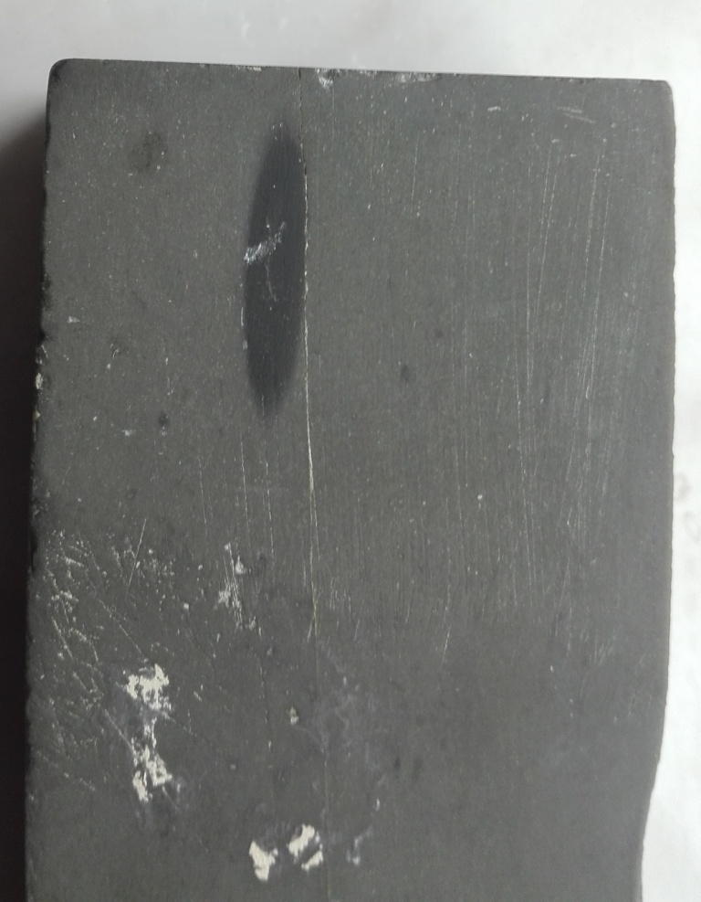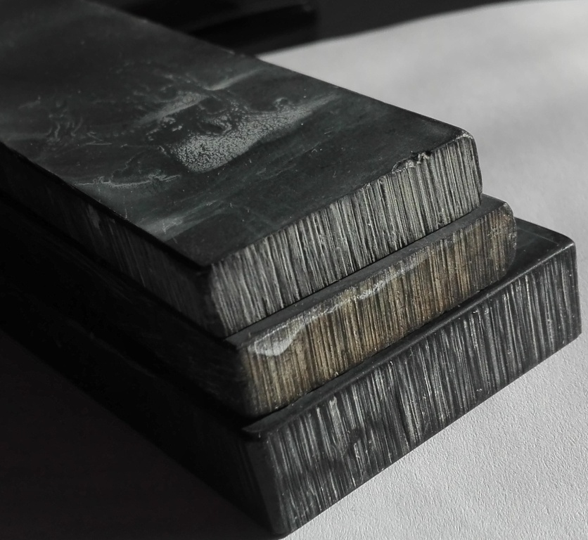 второй камень тоже на делмора похож, но грей (справа) больше. На левом пятна серые есть. Камни от разных продавцов, тот, что размером меньше мне как "тонкий сланец продали" вторым у одного парня разжился по бартеру, их у него много разных -ешеры, котикулы есть, а сейчас чарли форестеры распродает... Может я их на опыты Вам отправлю? Как Арма нож доделает в посылку кину за хлопоты с меня чехол Добавлено спустя 14 минут 32 секунды: Следующий сланец. После заточки бритва проходила тест на волос, есть боковые розпилы размер 164*45*12 мм, человек у кого сменял говорил он был с седлом. есть у меня еще с такими разпилами 133*32 мм и 135*35 мм, но они рабатоют грубее по малым думаю, что они атлянские сланцы, малые суспензию более менее дают, большой нменьше выделяет, чуток темнее (чернее) мелких однородный
