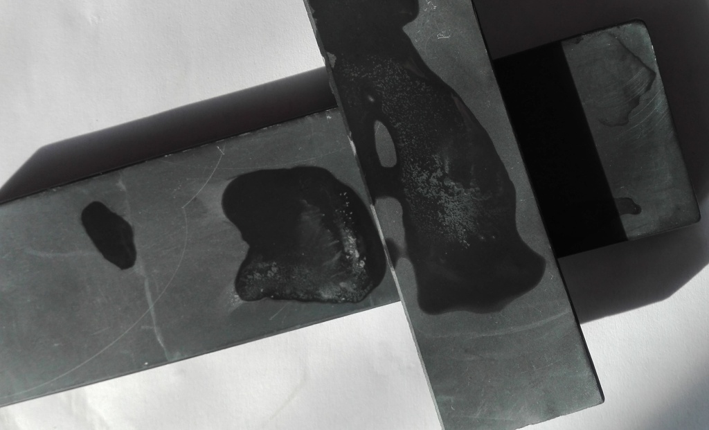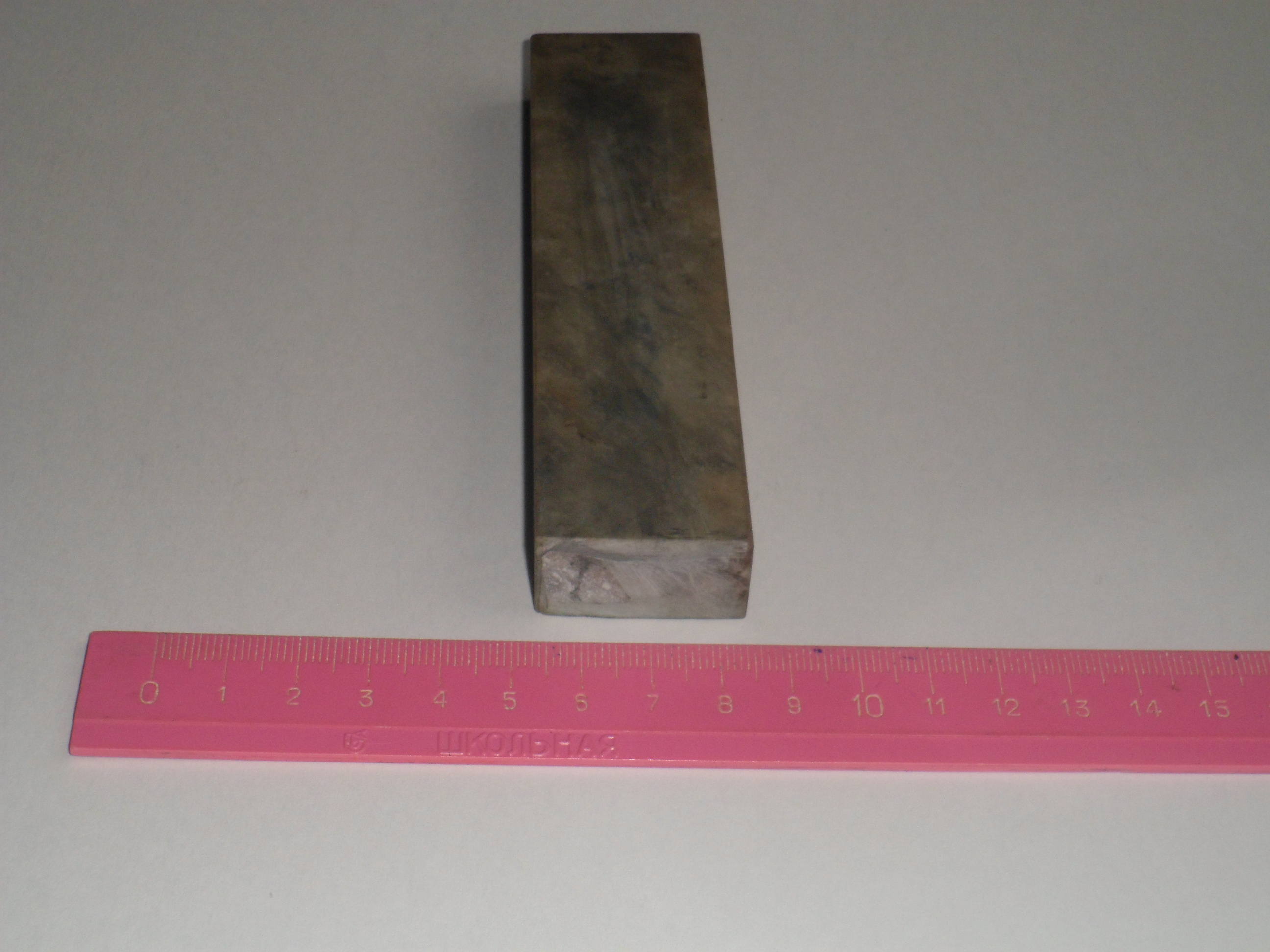 Следующий камень предположительно чарли форестер, на улице пасмурно лучше мобильным сделать фото не получается... Камень твердый, суспензию сам по себе не дает, если наводить чем то твердым то молочная еле сероватая. Мне два камня выдали, два заявлены как чарли форестеры, тот, что больше похож на чарли я уже опробовал стоят одинаково длинна ок. 9 дюймов ширина 2 дюйма, но этот можно распилить вдоль или на худой конец сурик с него отпилить, с первым такое не проделаешь там нижняя сторона вся побитая как у булыжника с мостовой и отслоения после выравнивания вылезли боюсь, что распиловку не переживет... Цвет камня темно-зеленый (если намочить особо зеленеву видно) цветом похож на чарли форестер, но у того зеленого чарли есть разводы красноватые (бурые), а у этого нет только на обратной стороне есть черное пятно (по которому его и определили как чарли, есть маленькие расплывчатые черные пятнышки), на лицевой стороне видно полупрозрачную прожилку есть трещинки и отслоения (как и у другого чарли). Камни при заточки вели себя "кажись одинаково", заточник бритв с меня еще не очень потому и "кажется". Брить после второго камня нет чего у продавца один чарли я купить не успел (тот был больше и весь полосатый как зебра) вот и второй у него берут, хочу себе третий взять потому вопрос - кто нибудь находил инфу (или в руках держал) о зеленых чарли форестерах с черными пятнами?