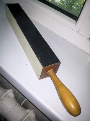 Re: вопрос по приспособе для правкиДеревяшка самая что ни на есть для бритв. Бритва правится на гладкой стороне кожи. На "бахтармяной" стороне режущая кромка заваливается ("залинзовывается"). Для ножей, может, и хорошо, но для бритв неприемлемо. На таком бруске на разные стороны наносятся разные пасты; действия на них называются доводкой. Некоторые любители вдавливают в дерево пасту ГОИ или золу хвоща, и получается притир. По их уверениям, режущую можно двигать на зерно — разумеется, не допуская появления "суспензии". ...и немедленно выпил.