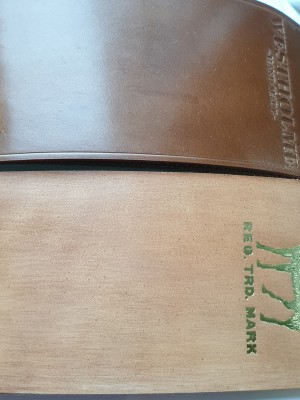 Кордован-ремень от WestholmeВ отличие от многих/большинства ремнеделов, он четко указывает tannery с которой берет кожу, ее полное торговое наименование (в моем случае Horween Bourbon Shell Cordovan), а куски кожи со штампом фабрики на тыльной стороне ставит на самые дорогие (широкие/длинные) ремни. У него на Фейсбуке среди свежих фото можно увидеть такой черный ремень 3х24 дюйма барберского типа как раз со штампом Horween Shell Cordovan