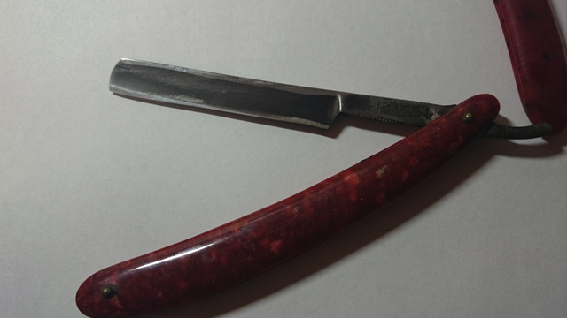 Вчера забрал бритву. Как и говорил связался с одним из форумчанинов из моего города. Ник ANATOL. Он и обещал посмотреть что можно сделать. Отдал ему бритву на заточку. Вот что получилось. Следы на месте коррозии остались, но режущая кромка целая. Спасибо Анатолию, восстановил как смог. Сказал что волос режет. Так что вечером сходил в душ чтобы распарить получше щетину и приступил к бритью.