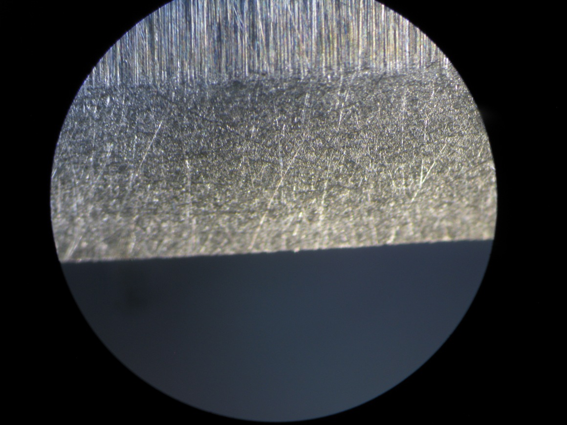 Итого: с использованием цусима-камня и цусима-нагура можно заточить бритву до состояния реза волоса на минимуме камней - 1000-цусима-финиш, но нужно следить за суспензией, хитрить и очень долго полировать кромку. Также отмечено постоянное микроскалывание кромки. Не ясно пока дело в бритве или в камне, но микропила держится постоянно и уходит только на финише. Зато для ножа это хорошо, поэтому тысячник+цусима-камень на кухню самое то. А для бритв надо покумекать как с ним быть, так-то камень достойный - быстрый, с однородным и тонким зерном - хорошая альтернатива котикулу и хватит надолго если не кокнуть, что сделать очень легко. А вот цусима-нагура отлично затирает риски на синтетиках до 6000 грит и может быть использовано вместо ботана. Но об этом потом - в следующем обзоре "о камне вакаса и его 5 друзьях". [spoiler=" фото кромки и самой бритвы после "цусима-гуанси-вакаса"] [/spoiler]