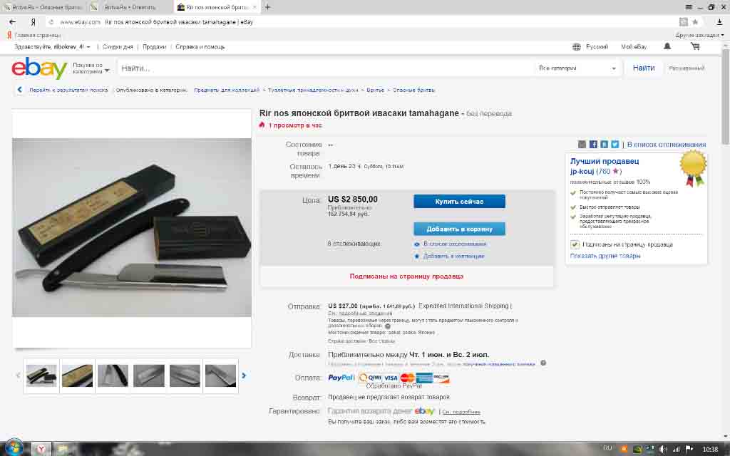Re: Флудим о заточке (чё попало)Это продавец такой. Свои первые 6 лотов он выставлял по демократичным условиям, а потом стал просто искать лохов среди гайдзинов. Бритва хоть и с именем, но столько не стоит. Углеродка.