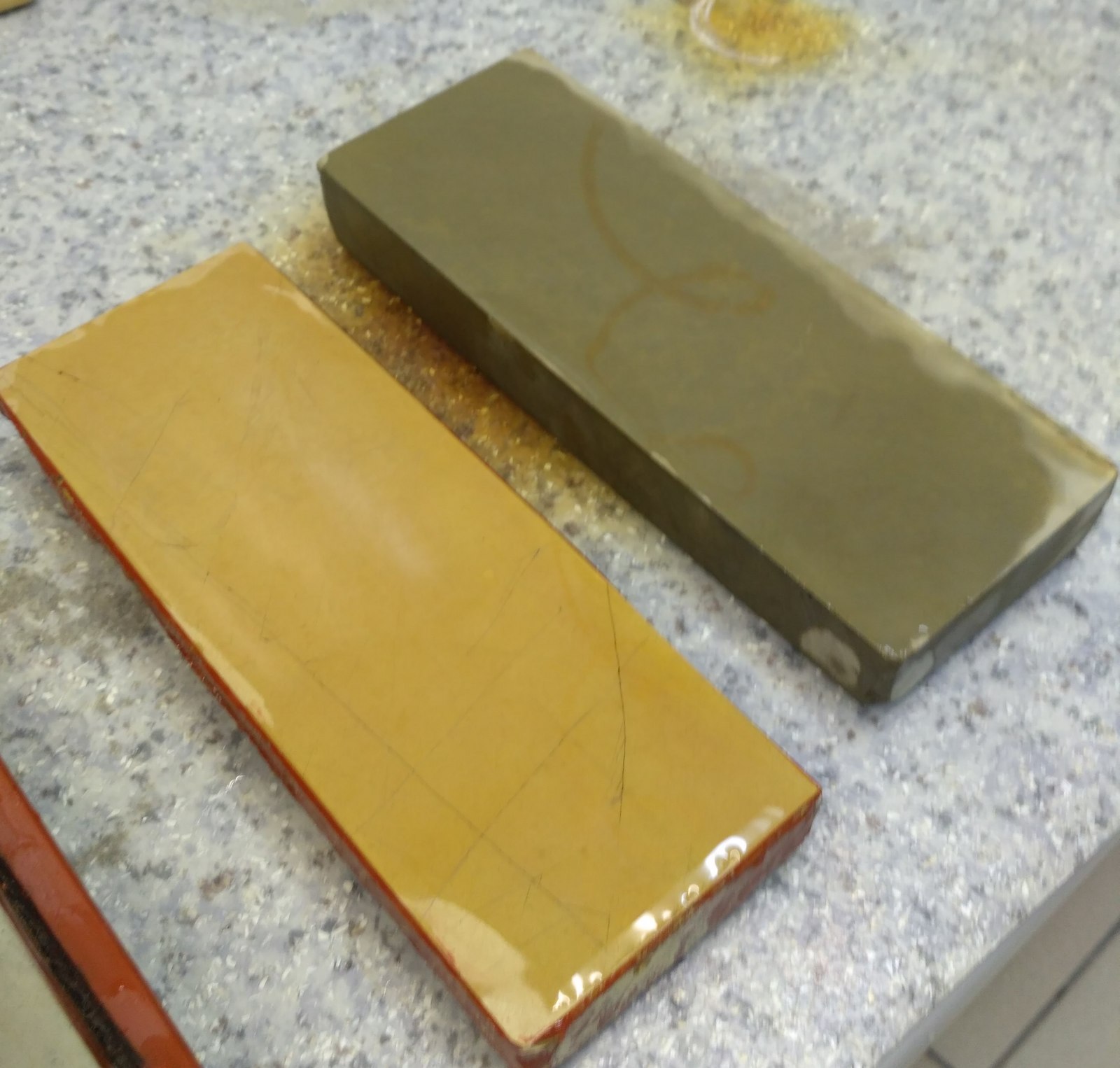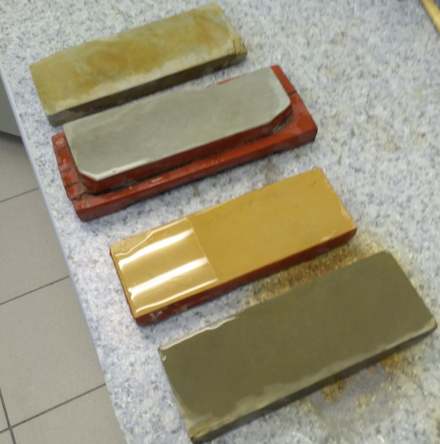 Из "маст хэв" - синтетики 4к Нанива, 1к Кинг и нечто желтое и в хлам засаленное (но зло жрущее нержу) грит на 400. Из интересного - японские синтетические финиш и предфиниш ориентировочно производства SENWA где-то на 6к и 10к. Надо будет кинуть в "опознание", может unsui что-то расскажет про них. Из приехавших натуралов - все твердые, тверже, чему меня был до этого,и воду практически не берут в себя. Невыровненний лапоть бледно-желтой расцветки,бледно- серый на подставке, "желток" и странный зеленовато-серый камень, который при первых тестах понравился мне больше всего. Spoiler Show