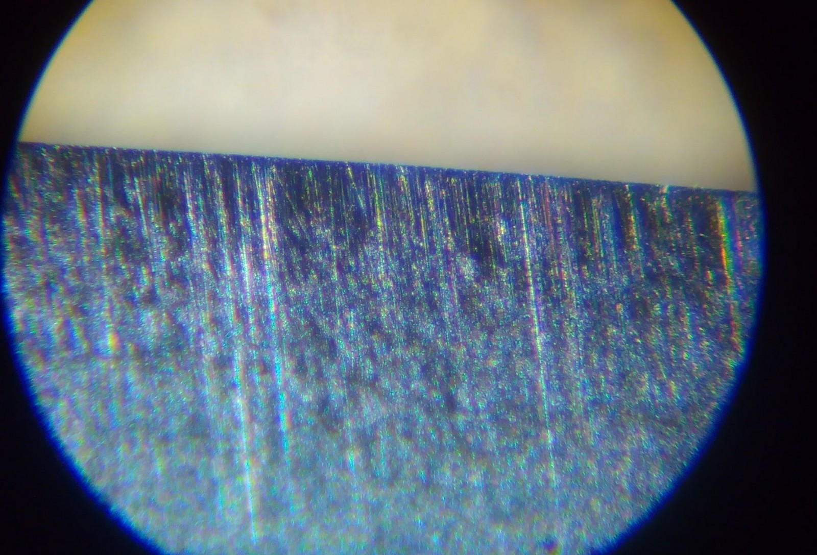 Re: Японские натуральные водные камни для бритв и их свойствДля лучшего восприятия уменьш увеличение и больше света, но и так всё ясно. Возьми любой 8000ник - результат лучше будет. В общем, чтд. Комплексное решение заточки - подбор и подготовка к работе сетов на основе синтетики и/или натуралов, нагуры, притиры, мусаты и ремни для правки.