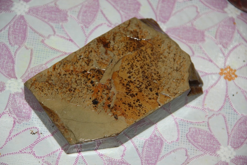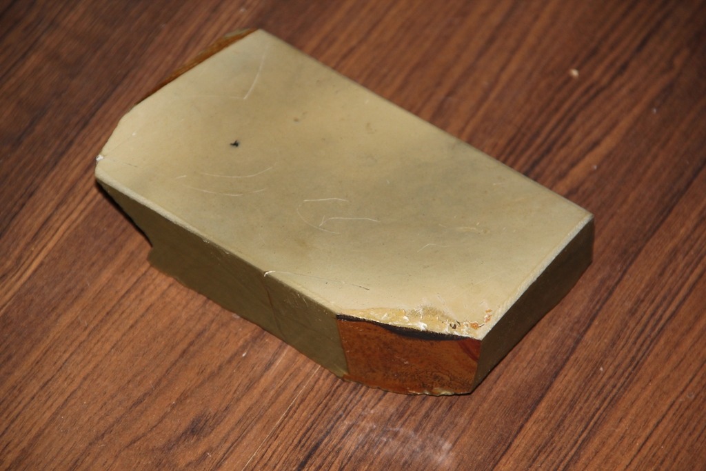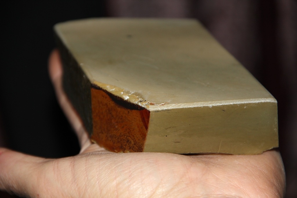 Камень покупал ,как и все свои камни ,у Макса со JNS. Вот такой же,только большего размера. http://www.japanesenaturalstones.com/wakasa-lv-4-5-a73/" onclick="window.open(this.href);return false; Теперь и моём экземпляре. Очень удобного бритвенного размера :достаточно широкий и недлинный. Купил напопробовать и после тестов, камень уехал к своему новому владельцу. Первое,что бросилось в глаза,так это однородная,без всяких включений,структура камня. Характер и картинка распила торца камня очень напомнила мне картинку распила Эшера. Покрыл лаком,притёр и в бой. Притёртый камень до 1200 порошка реально сильно зеркалит и получился очень гладким.. После заточного суехиро 1000/3000 приступил непосредственно к Вакасе с использованием всех имеющихся у меня нагур: ботан,меджиро,тензё,кома и томонагура. Можно было бы меджиро или тензё исключить,так как они имеют примерно одинаковое зерно,но решил,что кашу маслом не испортишь,поэтому в работе были все. Работал на камне,как и всегда ,круговыми движениями,чередуя с х-образными движениями вдоль длины камня. По мере потемнения и загустения суспензии приходилось разбавлять её водой до 5-6 раз до полного визуального исчезновения.и После этого,переходил на другую нагуру и т.д. После всех нагур, чистый камень и проба бритвы на прохождение теста на волос. При работе, сразу обратил внимание,что камень работает не так,как все мои Озуку и Накаямы, вместе с Шабудани. Хоть камень и гладкий,но работает не так тонко,как остальные. Чувствуется некая агрессия при доводке бритвы. Камень,реально работает очень быстро,поэтому время работы между нагурами у меня заметно сократилось.В конечном итоге,после чистого камня( около 50 проходов) бритва стала проходить тест. Бритьё получилось довольно комфортное,без раздражения и каких либо проблем. Но,не хватало,на мой предвзятый вкус,больщей мягкости. Тут, как раз пригодился тонкий сланец и следующее бритьё получилось уже намного комфортнее и мягче. В принципе,результат с тестированием этого камня меня удовлетворил и я с лёгким сердцем отправил его к своему клиенту,заказавшим недорогого японца. Но, я не учёл один нюанс,о котором давно уже забыл. Это опыт работы на подобных камнях с нагурами. Т.е. , перетачивая сотни бритв на японцах, у меня выработалась техника работы,о которой я сейчас уже не задумываюсь.Просто,точу и всё. Количество и концентрация суспензии,время работы с нагурами,величина давления и многое другое сидит у меня в подсознании. Я уже об этом не думаю. Но,у нового владельца( который,кстати, имеет опыт работы на разных камнях) возникли проблемы. При работе на новом камне с нагурами,получилась острая бритва,но побрить удалось только одну сторону лица. Т.е., бритва заточку не держала. В этом случае,думаю,может быть два варианта. 1.Недоведенность кромки. 2. Проблемы с металлом.( отпущенная сталь). Если второе исключить,то остаётся проблема с заточкой и тонкой доводкой. Почесав репу ,стал выяснять,что же произошло. В результате разбора полётом,оказалось ,что суспензия была слишком концентрированная и в процессе работы не разбавлялась водой,что впоследствии привело к завалу кромки. После правки на ремне,бритва какое то время брила, а потом перестала брить,т.к. кромка не была до конца доведена. Так как камень сам по себе быстрый и несколько агрессивный, вкупе с нагурами получил на выходе ядерную смесь. .Вот.