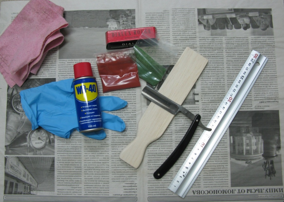 Борды издавна использовали для доводки режущего инструмента, например шпат на плоской деревяхе. Вот здесь (ссылка) немного мат. части по использованию притиров, в т.ч. из дерева. Пригодны они и для доводки бритвы. Материал борда - самшит, бальса, липа, береза, лимонное дерево и др., У дерева много преимуществ по сравнению с кожей и тканью: - не нужно ничего кроме дерева - легкость ремонта и нанесения пасты. Дерево можно спокойно обрабатывать, греть и поливать растворителями, даже водой – из бальсы инки делали плоты и каноэ. - хорошая твердость – мягче чугуна, но тверже кожи – критичные прогибы исключены. Самшит слишком дорог, а с другой стороны слишком тверд и без пор, а мне хотелось именно относительно мягкое и упругое дерево, с порами как депо абразива, поэтому выбор пал на бальсу. Итак: 1. Купить все ингредиенты - указаны на фото и сделать заготовку по мотивам винтажного ремня. Но в процессе выяснилось, что удобнее сделать более анатомичную рукоять и размер рабочей части около 50*150мм. Дерево должно быть выдержанным и сухим. 2. Ровняем плоскость на наждачной бумаге 240-500-1000 грит с контролем по сетке и лекальной линейке. Вот тут еще один плюс бальсы - легкость обработки. Пробовал для борда липовоую вагонку и березовую ламель - замучился выравнивать - долго, но для наших дел пойдет. Бальса прогибается от сильного нажатия, поэтому чтобы не принимать прогиб за ложный рисунок сетки, лучше рисовать маркером. 3. Нанесение пигмента. Меня волновало что лучше - чистый пигмент или паста, поэтому взял и диалюкс (ГОИ у меня с ужасными примесями, поэтому в опыт не брал). Для начала надо хорошенько вытереть или даже обмыть основание - много мелкой пыли после наждачки, затем собственно нанесение. Оба пигмента нормально втираются насухую, если обстучать, то и не пачкается. Паста наносится хорошо, не не очень равномерно. Нормально и с этиловым спиртом. Но хотелось по науке - на СОЖ с олеиновой кислотой. Рекомендуют наносить с детским маслом, но оно почти на чистом вазелиновом масле, поэтому не стал, да и оливкового масла поду рукой не было, зато был автомагазин с наждачкой и WD-40, на основе масла и жиров. Брызнуть смазки и нанести пигмента надо совсем чуть-чуть (на фото видно, что много всего нанес и перепачкал всё) и растереть. Таким путем достигается равномерное распределение абразива по всей поверхности притира. Крокус и диалюкс растираются просто шикарно, а вот оксид хрома не очень, но после подсыхания всё норм., его что его можно на сухую или попробовать с чем-то другим. На кожу таким ровным и тонким слоем не нанести. 4. Собственно тестирование работы. Тестировал бритвы, заточенные на синтетике и натурале. Работает (см. фото далее). Интересовало следующее: - будет ли дерево царапть металл? Ни капельки - оно же мягче металла - на последних фото кромки виды следы от деревяхи - никаких царапин. Я даже потом сам над собой ржал - значит кусок земли в виде камня меня не смущает, а почти чистая целлюлоза с пигментами вызывают сомнения. На фотках видны следы дерева - никаких царапин нет. - как вообще работают оксид хрома и оксид железа? Нормально работают. Далее фото работы этих пигментов на бритве заточенной на синтетике и натурале. Сначала работал на оксиде хрома 10 проходов на сторону, протирал бритву (это надо обязательно делать), затем на крокусе 10раз на сторону, протирал и фотать