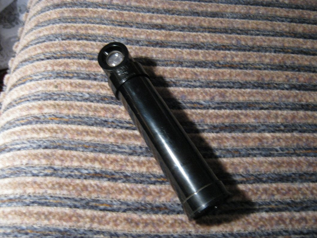 Короче, всем рекомендую такую конструкцию, но 15 крат. В ручке вставлены две средние батарейки, а под увеличительным стеклом микролампочка накаливания. Кстати, яркость света весьма умеренная. Думал из-за батареек, но с новыми был тот же эффект.