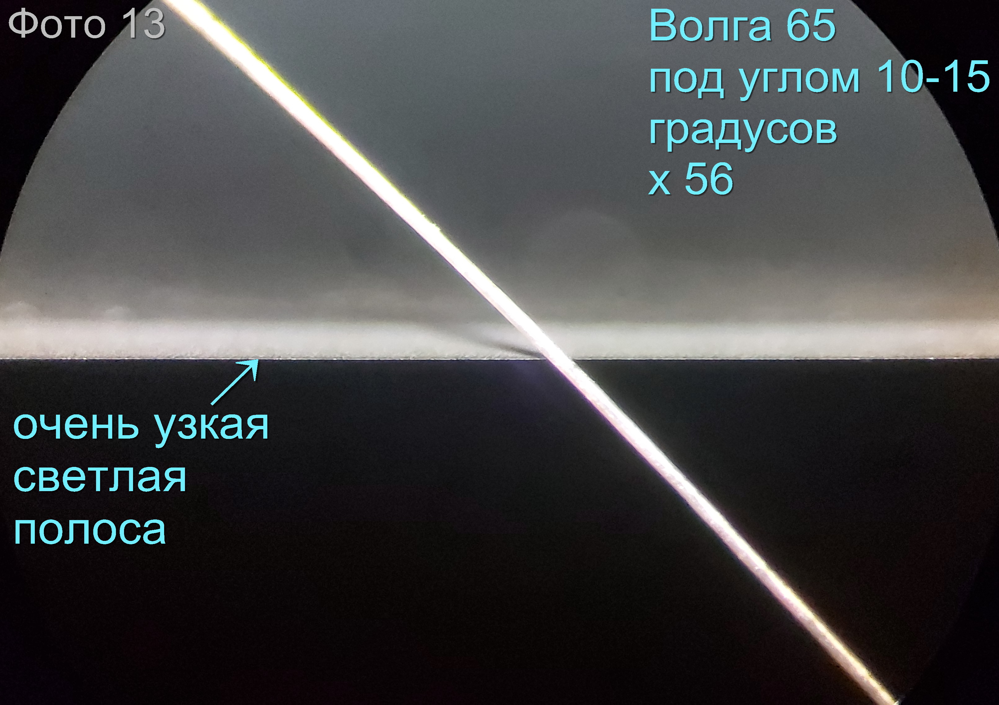 Второй способ просмотра опасной бритвы под микроскопом – это просмотр под углом около 10-15 градусов к объективу. Свет идет спереди и под углом около 45 градусов к горизонтали. (ФОТО 6) Таким способом мы можем увидеть остроту РК. Я постараюсь объективно показать как выглядит РК опасной бритвы Волга 65 в динамики заточного процесса, бритья и правки на подвесном ремне. На ФОТО 7 показана бритва Волга 65 после плохой доводки на Гуанси. В данном случае РК имеет большой радиус скругления (она тупая), поэтому она отражает свет в виде широкой светлой полосы. На ФОТО 8 показана бритва Волга 65 после хорошей доводки на Гуанси. В данном случае РК имеет маленький радиус скругления (она острая), поэтому она отражает свет в виде узкой светлой полосы. РК острая. На ФОТО 9 показана бритва Волга 65 после правки на чистом подвесном ремне. Радиус скругления РК стал очень маленький (она очень острая), в результате чего она почти не отражает свет. На отдельных участках РК слабо видна очень узкая светлая полоса. РК очень острая. На ФОТО 10 показана бритва Волга 65 после первого бритья. На РК появилось множество замин - признаки затупления, вследствие чего, РК отражает свет в виде широкой прерванной светлой полосы. РК затупилась. На ФОТО 11 показана бритва Волга 65 после правки на чистом подвесном ремне. Видно что заминов нет, на отдельных участках РК выстроилась в струнку вследствие чего отражает свет в виде очень узкой прерванной светлой полосы. РК опять острая. На ФОТО 12 показана бритва Волга 65 после второго бритья. На РК опять появилось множество замин - признаки затупления, вследствие чего РК отражает свет в виде широкой прерванной светлой полосы. РК затупилась. На ФОТО 13 показана бритва Волга 65 после правки на чистом подвесном ремне. Заминов нет. РК полностью выстроилась в струнку, вследствие чего отражает свет в виде очень узкой светлой полосы. РК опять острая. После ежедневного бритья в течение 5 дней, наблюдения показали, что в дальнейшем РК бритвы Волга 65 после очередного бритья будет переходить в состояние на ФОТО 12, а после правки на чистом ремне возвращатся в состояние на Фото 13. Если быстро переключат фотографии, динамика изменения РК прослеживается лучше.