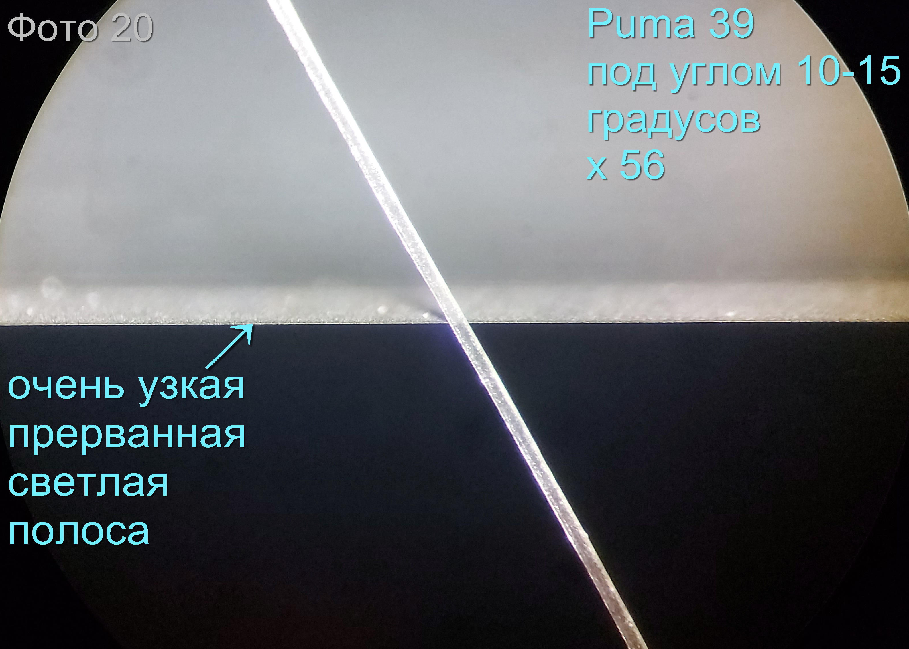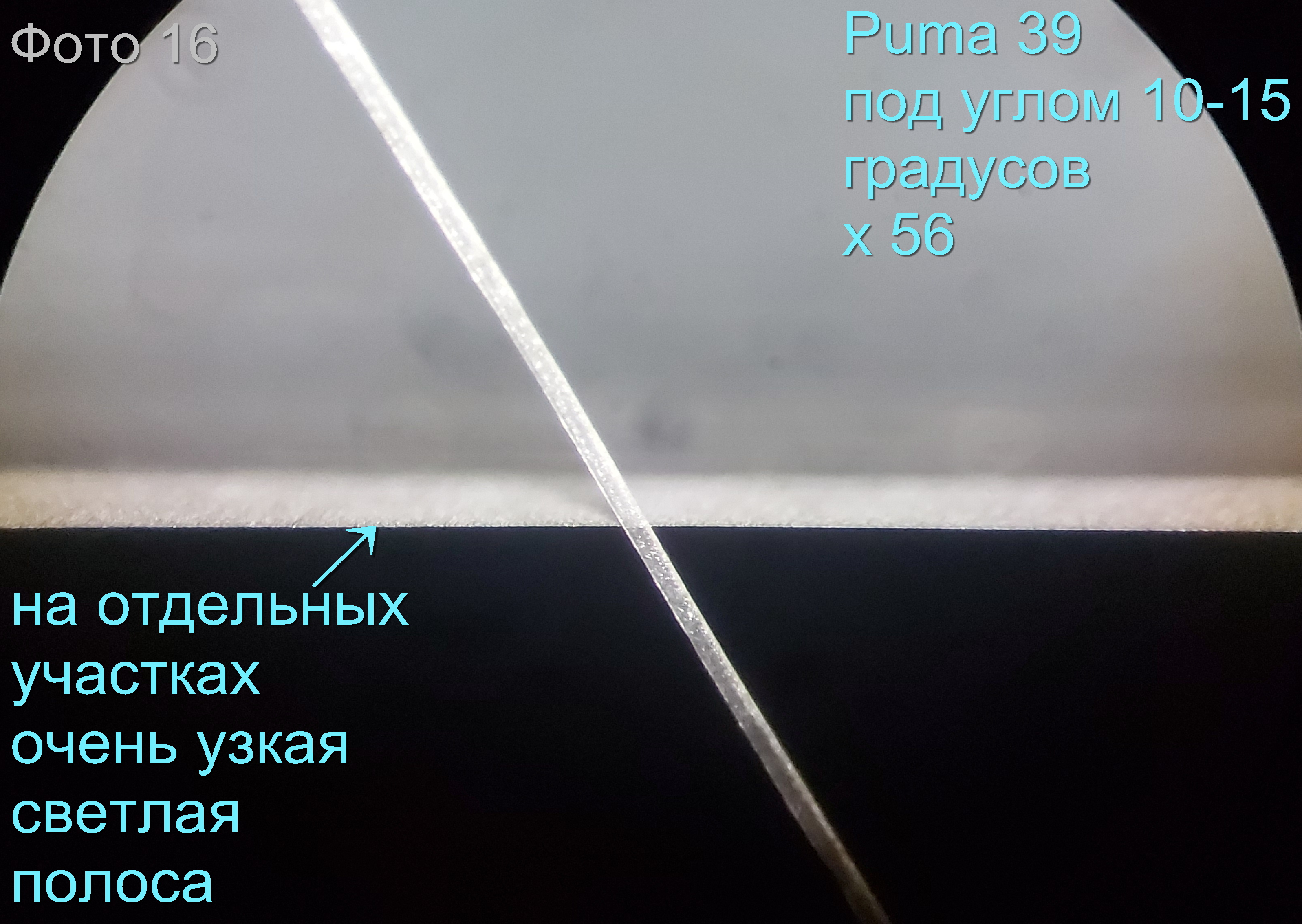 А теперь давайте посмотрим как выглядит РК опасной бритвы Puma 39 в динамики заточного процесса, бритья и правки на подвесном ремне. На ФОТО 14 показана бритва Puma 39 после плохой доводки на Гуанси. В данном случае РК имеет большой радиус скругления (она тупая), поэтому она отражает свет в виде широкой светлой полосы. На ФОТО 15 показана бритва Puma 39 после хорошей доводки на Гуанси. В данном случае РК имеет маленький радиус скругления (она острая), поэтому она отражает свет в виде узкой светлой полосы. РК острая. На ФОТО 16 показана бритва Puma 39 после правки на чистом подвесном ремне. Радиус скругления РК стал очень маленький (она очень острая), в резултате чего она почти не отражает свет. На отдельных участках РК слабо видна очень узкая светлая полоса. РК очень острая. На ФОТО 17 показана бритва Puma 39 после первого бритья. На РК появилось множество замин – признаки затупления, вследствие чего РК отражает свет в виде узкой прерванной светлой полосы. РК затупилась. На ФОТО 18 показана бритва Puma 39 после правки на чистом подвесном ремне. Видно что заминов нет, на отдельных участках РК выстроилась в струнку вследствие чего отражает свет в виде очень узкой прерванной светлой полосы. РК опять острая. На ФОТО 19 показана бритва Puma 39 после второго бритья. На РК опять появилось множество замин - признаки затупления, вследствие чего РК отражает свет в виде широкой прерванной светлой полосы. РК затупилась. На ФОТО 20 показана бритва Puma 39 после правки на чистом подвесном ремне. Заминов нет. РК частично выстроилась в струнку, вследствие чего отражает свет в виде очень узкой прерванной светлой полосы. РК опять острая. После каждодневного бритья в течении 5 дней, наблюдения показали, что в дальнейшем РК бритвы Puma 39 после очередного бритья будет пероходит в состояние на ФОТО 19, а после правки на чистом ремне возвращатся в состояние на Фото 20. Напоминаю, что если быстро переключат фотографии, динамика изменения РК прослеживается лучше.