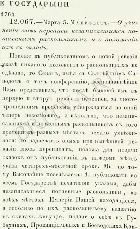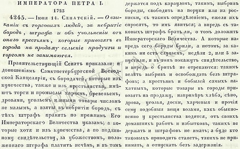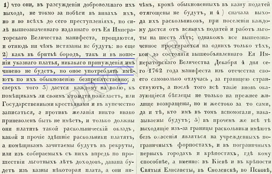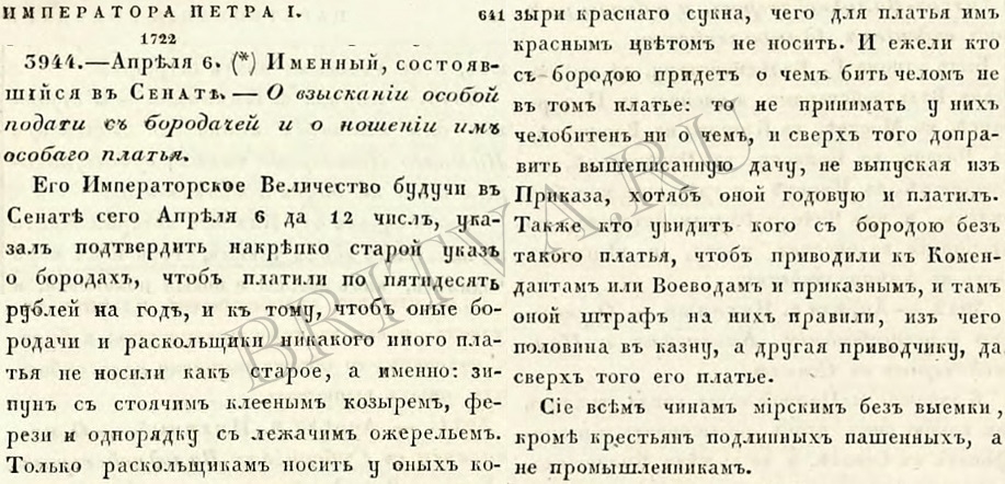 Императрица Екатерина II В интернете часто пишут, что указом от 6 апреля 1772 г., Екатерина II отменила пошлину/сбор на ношение бороды, но с оговоркой: „… государственные чиновники, военные и придворные должны были „оставлять лицо босым”! Более того, очень авторитетно, но бездоказательственно, утверждается, что именно поэтому, этот день принято считать в России Днем бородача. Это другое из белых пятен на карте российской истории, потому что в Полном собрании законов Российской империи за 1772 г. нет ни одного указа от 6 апреля. За месяц апрель, и за весь 1772 г. нет указ, который отменяет налог на бороду! Также, с 1762 г. по 1774 г. нет указа, в котором написано, что „… государственные чиновники, военные и придворные должны были „оставлять лицо босым". Может быть, был такой указ, но он не сохранился до наших дней. В таком случае откуда же взялся текст „… оставлять лицо босым"? Я задал этот вопрос и попросил найти текст этого указа или другого документа: - директору Института российской истории Российской академии наук; - декана исторического факультета Московского государственного университета; - директору Института истории Санкт-Петербургского государственного университета; - деканов исторических факультетов Тверского, Омского, Воронежского, Ярославского и других государственных университетов. Большинство из них любезно ответили, что вопрос очень интересный, но они не встречали такого указа и пообещали поискать информацию. Один из ученых высказал странную гипотезу, которую я опроверг официальными документами. И все, больше ни ответа, ни привета. Это было два месяца назад. Итак, я продолжаю показывать сохранившихся документов. Екатерина II, указом от 14 декабря 1762 г. разрешила раскольникам беспошлинное ношение бород. Ученные считают, что именно этим указом Екатерина II отменила пошлину/сбор на ношение, но сам запрет на ношение бород остался для государственных чиновников, военных и придворных. Фото №29: Екатерина II, 1762 г. Указ № 11725. - Декабря 14. - О позволеніи раскольникамъ выходить и селиться въ Россіи на мѣстахъ означенныхъ въ прилагаемому у сего реэстрѣ. (На фото № 31 я подчеркнул интересующий нас текст). Фото №30: продолжение указа № 11725 Фото №31: продолжение указа № 11725 Фото №32: продолжение указа № 11725 Фото №33: продолжение указа № 11725 Фото №34: Екатерина II,1764 г. Указ № 12067. - Марта 3. – О учиненiи вновь переписи незаписавшимся потаеннымъ раскольникамъ и о положенiи ихъ въ окладъ. Этим указом Екатерина II во второй раз подтверждает, что разрешила раскольникам беспошлинное ношение бород. (На фото № 35 я подчеркнул интересующий нас текст). Фото №35: продолжение указа № 12067 Фото №36: Продолжение указа № 12067