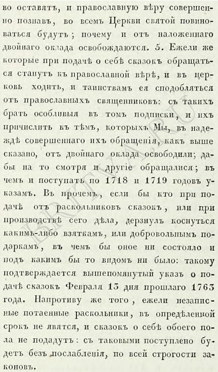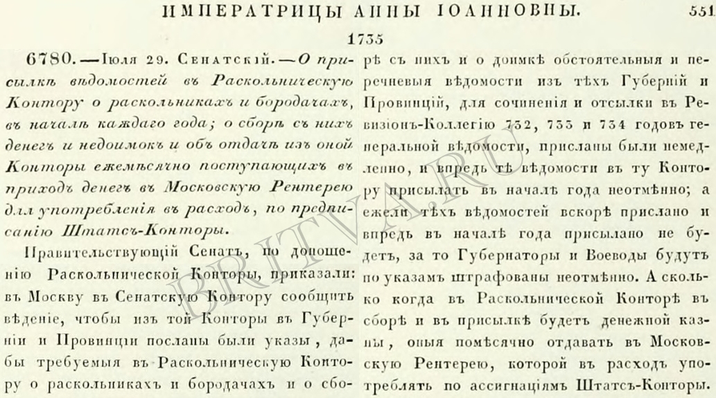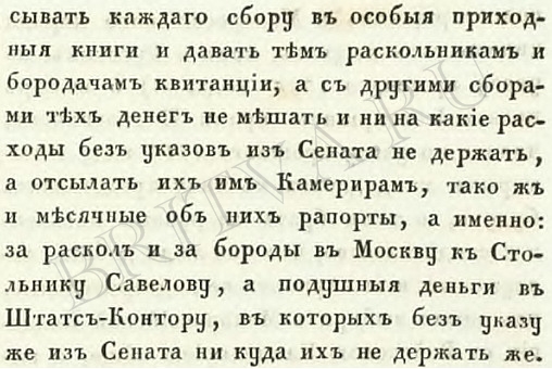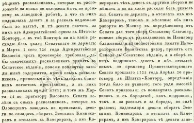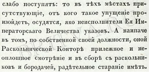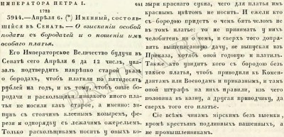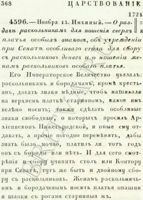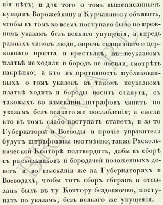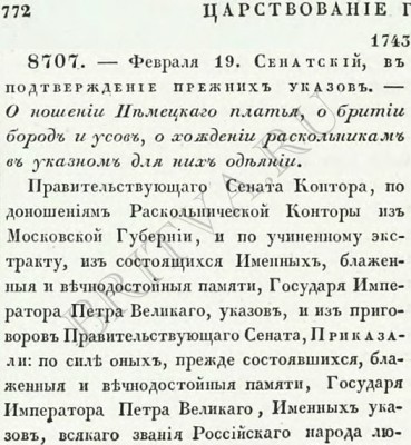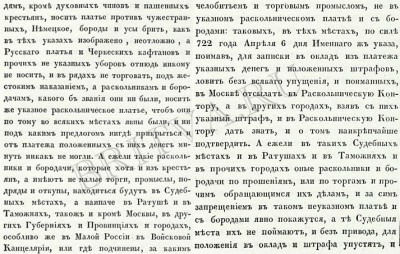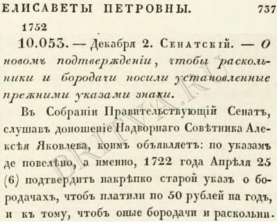 Императрица Анна Ивановна Фото №17: Анна Ивановна, 1735 г. Указ № 6780. - Iюля 29. - О присылкѣ вѣдомостей въ Раскольническую Контору о раскольникахъ и бородачахъ, въ началѣ каждаго года; о сборѣ съ нихъ денегъ и недоимокъ и объ отдачѣ изъ оной Конторы ежемѣсячно поступающихъ въ приходъ денегъ въ Московскую Рентерею для употребленiя въ расходъ, по предписанiю Штатсъ-Конторы. Императрица Елизавета Петровна Фото №18: Елизавета Петровна, 1743 г. Указ № 8707. - Февраля 19. - О ношеніи Нѣмецкаго платья, о бритіи бородъ и усовъ, о хожденіи раскольникамъ въ указномъ для нихъ одѣяніи. Фото №19: продолжение указа № 8707 Фото №20: продолжение указа № 8707 Фото №21: Елизавета Петровна,1748 г. Указ № 9479. - Февраля 11. - О подтвержденіи, чтобы никто, кромѣ священнаго и церковнаго причта и крестьянъ, не ходилъ въ неуказномъ платьѣ и не носилъ бороды. Фото №22: продолжение указа №9479 Фото №23: продолжение указа №9479