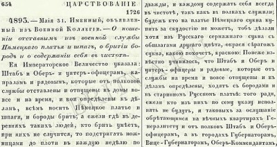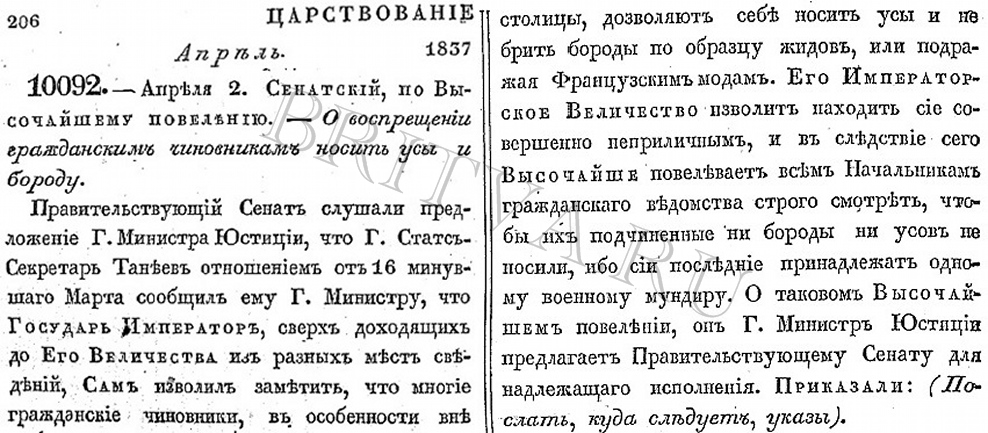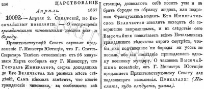 Указы о бритья бороды и усов в Российской империи.Как дополнение: не помню в котором из циркуляров или указов, но где-то встречал разъяснение о том, что считалось "бородой" во времена Елизаветы Петровны. Точно помню, что вопрос относился к студентам высших светских учебных заведений, в попытках отращивания бород которыми контролирующие органы усмотрели некое вольнодумство. Так вот, борода тогда законодательно определялась как щетина сроком от 2-х недель и более.