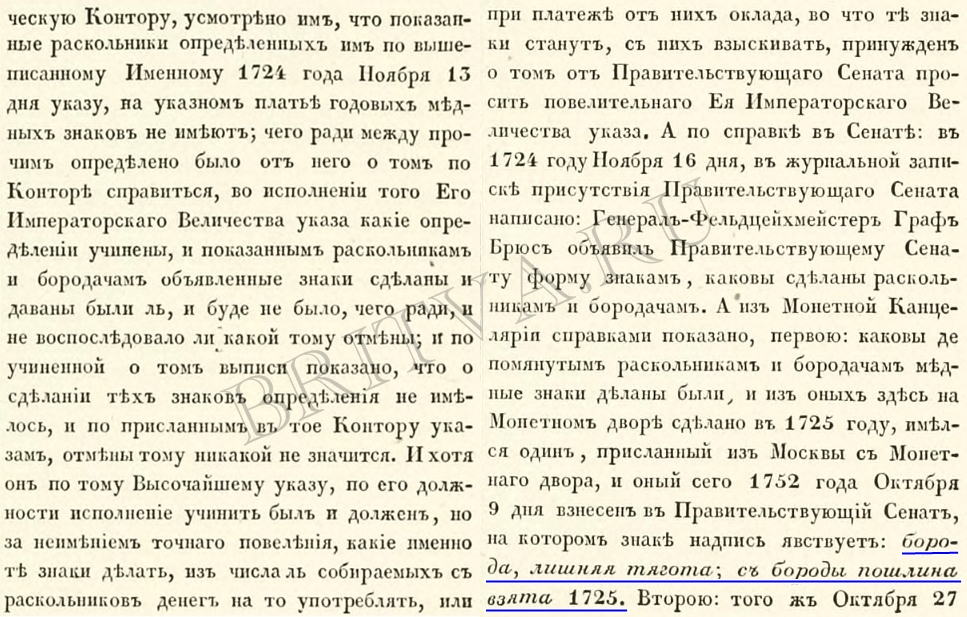 Фото №9: Пётр I, 1723 г. Указ № 4245. - Iюня 14. - О взыканіи съ торговыхъ людей, за небритіе бородъ, штрафа и объ увольненіи отъ онаго крестьянъ, которые привозятъ въ города на продажу сельскіе продукты и торгомъ не занимаются. Фото №10: Пётр I, 1724 г. Указ № 4596. - Ноябра 13. - О раздачѣ раскольникамъ для ношенія сверхъ платья особыхъ знаковъ, объ учрежденіи при Сенатѣ особливаго стола для сбору съ раскольниковъ денегъ и о ношеніи женам раскольниковъ особаго платья. Фото 11: Бородовой знак 1725 г. (Источник фото: monetnik.ru). На лицевой стороне надпись „СБОРОДЫ ПОШЛИНА ВЗѦТА”, оборотная сторона гладкая. По гурту надпись: „БОРОДА ЛИШНѦѦ ТѦГОТА”. Как я уже показал, до наших дней сохранилось только три основных вида бородовых знаков: 1699 г., 1705 г. и 1725 г. Императрица Екатерина I Фото №12: Екатерина I, 1726 г. Указ № 4893. - Маія 31. - О ношеніи отставнымъ изъ военной службы Нѣмецкаго платья и шпагъ, о бритіи бородъ и о содержаніи себя въ чистотѣ. Фото №13: продолжение указа № 4893 Фото №14: Екатерина I, 1726 г. Указ № 4900. - Iюня 3. - О сборѣ съ Выгорѣцкихъ раскольниковъ, какъ подушныхъ, такъ и за расколъ и за бороды денегъ Земскимъ Коммисарамъ, и объ отсылкѣ собранныхъ денегъ въ Штатсъ-Контору, а за расколъ и за бороды въ Москву къ Стольнику Савелову. Фото №15: продолжение указа № 4900 Фото №16: продолжение указа № 4900