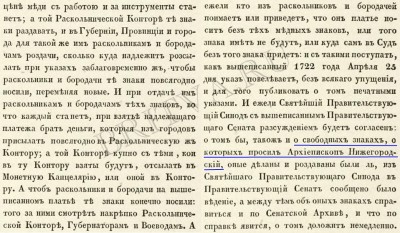 Фото №24: Елизавета Петровна,1752 г. Указ № 10053. - Декабря 2. - О новомъ подтвержденіи, чтобы раскольники и бородачи носили установленные прежними указами знаки. Очень интересный указ. В нем: - Во-первых, здесь цитировали полную надпись на бородовых знаков 1725 г. На фото № 26, я подчеркнул текст: „борода, лишняя тягота; с бороды пошлина взята 1725”. - Во-вторых, в указе подробно говориться о чеканке и выдаче бородовых знаков, в том числе о переплавке в копеек наличных старых невостребованных знаков. На фото № 27, я подчеркнул текст о переплавке. - В-третьих, в указе написано, что архиепископ Нижегородский просил о выдаче свободных (безплатных) бородовых знаков. На фото № 28, я подчеркнул этот текст. Фото №25: продолжение указа №10053 Фото №26: продолжение указа №10053 Фото №27: продолжение указа №10053 Фото №28: продолжение указа №10053