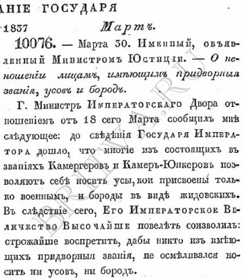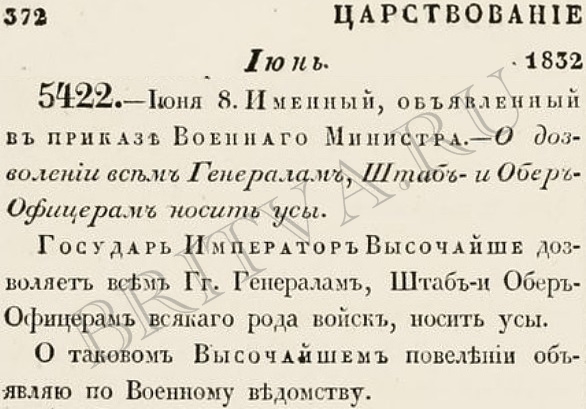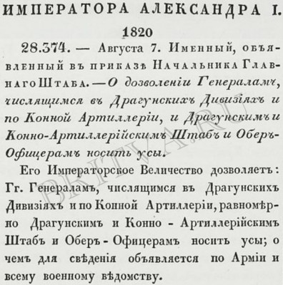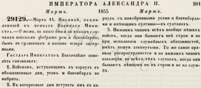 Император Александр I Фото №37: Александр I, 1820 г. Указ № 28374. - Августа 7. – О дозволеніи Генераламъ, числящимся въ Драгунскихъ Дивизіяхъ и по Конной Артиллеріи, и Драгунскимъ и Конно-Артиллерійскимъ Штабъ и Оберъ-Офицерамъ носить усы. Император Николай I Павлович Фото №38: Николай I, 1832 г. Указ № 5422. - Iюня 8. - О дозволеніи всѣмъ Генераламъ, Штабъ- и Оберъ-Офицерамъ носить усы. Фото №39: Николай I, 1837 г. Указ № 10076. - Марта 30. - О неношеніи лицамъ, имѣющимъ придворныя званія, усовъ и бородъ. Фото №40: Николай I, 1837 г. Указ № 10092. - Апрѣля 2. - О воспрещеніи гражданскимъ чиновникамъ носить усы и бороду. Император Александр II Николаевич Фото №41: Александр II, 1855 г. Указ № 29129. - Марта 14. - О томъ, въ какiе дни и въ какихъ случаяхъ войскамъ фабрить усы и бакенбарды, быть въ султанахъ и носить чешуи загнутыми. (Фабрить означает красить особой косметической краской, так называемой фаброй, усы, бороду). В воскресные дни вступать имъ в караулъ съ нафабренными усами и бакенбардами. Фото №42: Рисунок с обозначениями, что такое „чешуя” (подбородный ремень с чешуей) и что такое „султан”: Фото №43: Александр II, 1855 г. Указ № 29859а. - Ноября 25. – О ношенiи усовъ всѣмъ гражданскимъ чинамъ морскаго вѣдомства.