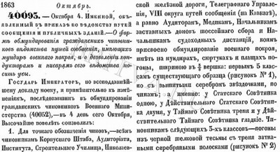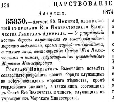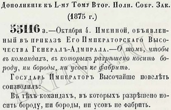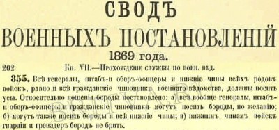 Фото №44: Александр II, 1863 г. Указ № 40052. - Сентября 10. - О формѣ обмундированія гражданскихъ чиновниковъ Военнаго Министерства и о дозволеніи топографамъ и писарямъ сего Министерства носить усы. Фото №45: продолжение указа № 40052 Фото №46: Александр II, 1863 г. Указ № 40093. - Октября 4. - О формѣ обмундированія гражданскихъ чиновниковъ вѣдомства путей сообщенія, имѣющихъ мундиръ военнаго покроя, и о дозволеніи кондукторамъ и писарямъ сего вѣдомства носить усы. Фото №47: продолжение указа № 40093 Фото №48: Сводъ Военныхъ постановленій 1869 года Кн. VII. – Прохожденіе службы по воен. вѣд. „Статья 855. Всѣ генералы, штабъ-и оберъ-офицеры и нижніе чины всѣхъ родовъ войскъ, равно и всѣ гражданскіе чиновники военнаго вѣдомства, должны носить усы. Относительно ношенія бороды постановлено: а) всѣ вообще генералы, штабъ- и оберъ-офицеры и гражданскіе чиновники могуть носить бороды, по желанію; б) могутъ также носить бороды и всѣ нижніе чины; в) нижнимъ чинамъ войскъ гвардіи и гренадеръ бородъ не брить”. Фото №49: Александр II, 1874 г. Указ № 53839. - Августа 20. - О разрѣшеніи носить бороды служащимъ во всѣх войскахъ, кромѣ гвардіи и гренадеръ, а также лицъ, состоящихъ въ Свитѣ Его Величества и чиновъ Главныхъ Управленій Военнаго Министерства. Фото №50: Александр II, 1874 г. Указ № 53830. - Августа 20. - О разрѣшеніи носить бороды служащимъ во всѣхъ командахъ морскаго вѣдомства, кромѣ гвардейского экипажа, а также лицъ, состоящихъ въ Свитѣ Его Величества и чиновъ, служащихъ въ учрежденіяхъ Морскаго Министерства.