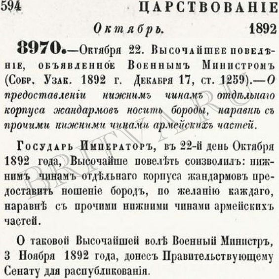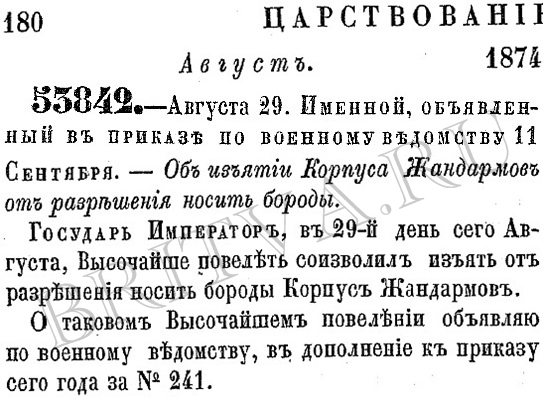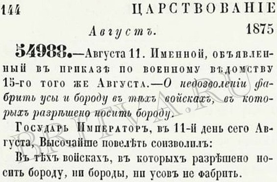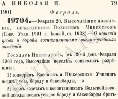 Фото №51: Александр II, 1874 г. Указ № 53842. - Августа 29. - Объ изъятіи Корпуса Жандармовъ отъ разрѣшенія носить бороды. Фото №52: Александр II, 1875 г. Указ № 54988. - Августа 11. – О недозволеніи фабрить усы и бороду въ тѣх войскахъ, въ которыхъ разрѣшено носить бороду. (Фабрить означает красить особой косметической краской, так называемой фаброй, усы, бороду). Следует повторный указ „не фабрить” (не красить). Фото №53: Александр II, 1875 г. Указ № 55116а. - Октября 4. - О томъ, чтобы въ командахъ, въ которыхъ разрѣшено носить бороду, ни бороды, ни усовъ не фабрить. Не надо думать, что кто-то красил усы из-за суетности. До этих двух указов они чернили усы, выполняя кавалерийского устава, принятым во времена правления Елизаветы Петровны. Фото №54: В кавалерийском уставе (Экзерциции) 1755 года, часть 1, глава 10, статья 136, пункт второй, написано: "Каждому кирасиру и драгуну надлежитъ, какъ возможно стараться усы отращивать, которыебъ всегда въ строяхъ и караулахъ вверхъ подчесаны, и подчернены были, а у гранодеръ конныхъ можно усы, какъ возможно длинно выростя, по щекамъ заворачивать; у кого же по молодымъ лѣтамъ натуральныхъ усовъ еще нѣтъ, или по природѣ пустобородъ, то употреблять такимъ образцомъ накладные". Как видите, если натуральных не было, применяли накладные усы. Император Александр III Александрович Фото №55: Александр III, 1892 г. Указ № 8970. - Октября 22. - О предоставленіи нижнимъ чинамъ отдѣльнаго корпуса жандармовъ носить бороды, наравнѣ съ прочими нижними чинами армейскихъ частей. Император Николай II Александрович Историки считают, что последний императорский указ на тему бород был издан уже в начале XX века, в 1901 году: император Николай II своей высочайшей волей разрешил ношение бород, усов и бакенбардов даже юнкерам. Фото №56: Николай II, 1901 г. Указ № 19704. - Февраля 20. - О ношеніи усов и бороды воспитанниками военно-учебныхъ заведеній. В конце статьи еще раз объясню, что пометил фотографии водяным знаком ради одной единственной цели - чтобы, когда в результате поиска люди их увидят, потом они зайдут на сайт и будут читать про опасных бритв. Кроме того, и ежу понятно, что зная номер и год указа, его очень легко можно найти в оригинале. Статья состоит из множество частей, потому что в одном посту можно выкладыват ограниченное количество фотографии и в то же время, когда указ состоит из несколько фотографии, они должни находится вместе. В течение полгода я просмотрел более 40 тыс. страниц, и думаю, что наверное не успел найти всех указов и я убежден, что есть еще, по крайней мере, несколько штук. К сожалению, некоторые вещи все еще остаются „белыми пятнами” из-за неполноты имеющихся архивных источников. Но я надеюсь, что рано или поздно эти пробелы заполняться. На всякий случай у меня такая просьба. Если кто-то найдет информацию о неизвестном указе росийских императоров или императриц, связанным с бритьем, пусть сначало посмотрит на него своими глазами, убедиться в его существования и что он относиться к теме, а потом пусть напишет его номер и год или покажет фото. Потом я его поставлю среди других указов в хронологическом порядке. Я выложил 31 указов, статья Свода военных постановлений и статья Кавалерийского устава (Экзерциции). Может быть, кому-то всё это покажется скучным, но для меня эти документы являются бесценными кусочками российской истории! И я надеюсь, вам интересно о