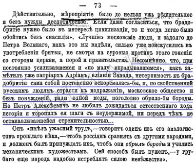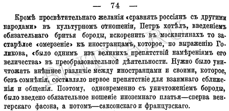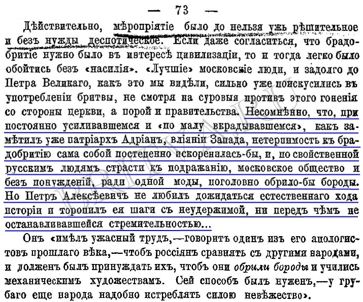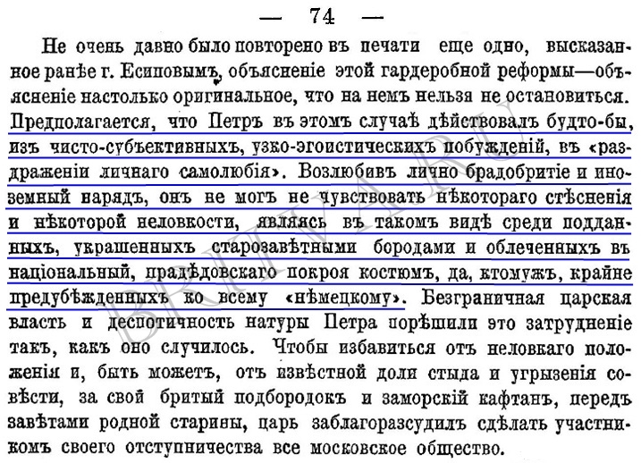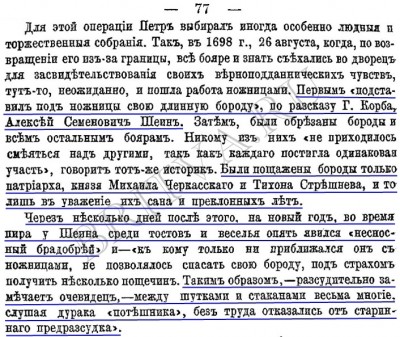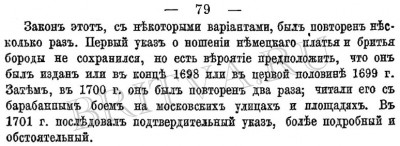 Большое спасибо всем, кто выразил свой интерес к статье лайком/лайками! anton, тебе отдельное спасибо за интересную книгу, она является прекрасным первоисточником! Я нашел в ней, как новые вещи, так и вещи, которые объясняют существования уже известной информации. Например, Владимир Михневич ответил на вопросы: - Сколько бритв имелось у царя Михаила Федоровича в 1634 г. (годы правления - 1613-1645). - Сколько бритв купили в 1650 г. для следующего царя - Алексея Михайловича (годы правления - 1645-1676), Фото №57: Он написал о постепенности „гардеробной” реформы (оказывается, современники так ее называли), Фото №58: Теперь мне понятно откуда, вероятно, взялась распространенная информация о бритья боярина Шейна и о массовом бритьем во время пира у него, Фото №59: И еще, теперь мне понятно откуда, вероятно, взялась распространенная информация о том, что Петр I посылал за границу российских брадобреев учиться „барбирскому” ремеслу, Фото №60: Автор упоминает о несохранившихся четырех указов Петра I,Фото №61: Он рассуждает о социально-культурных предпосылках реформы, Фото №62, Фото №63: В то же время написал и о возможных личных причинах, Фото №64: Об авторе книги „Исторические этюды русской жизни”, (глава „Исторiя русской бороды”), том 2, 1882 г. - Владимир Осипович Михневич, псевдоним - Коломенский Кандид (1841-1899) - русский писатель, журналист, историк быта, краевед и публицист. В 1879-1886 гг. опубликовал сборники „Исторические этюды русской жизни”, Фото №65: