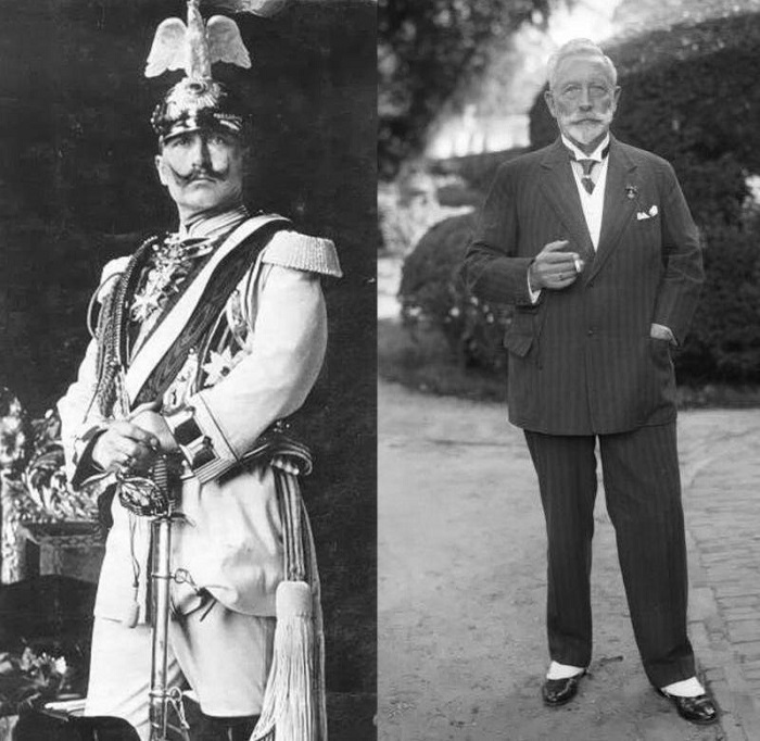Как видим, немецкая мода конца 19-го века вполне перекликается с российской. Густые вислые бакенбарды с усами в стиле Александра II, затем густая полная борода в стиле Александра III. Кайзер Вильгельм ІІ после отречения тоже добавил к усам аккуратную бородку, вполне в духе Николая ІІ (которому приходился кузеном, то есть двоюродным братом). Правда, на немецкий манер, с пробритой зоной бакенбард:
