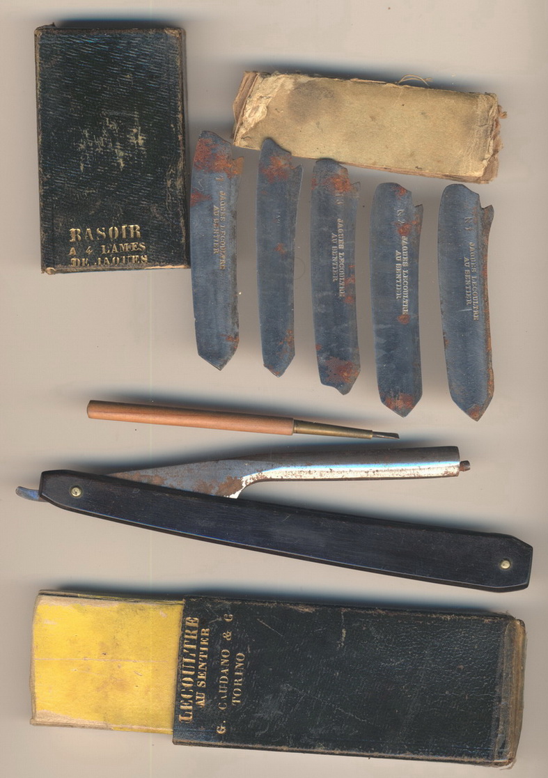 Вообще, судя по желтой бумажке на втором фото, должно было быть семь лезвий, потому что это не просто бумажка, а что-то вроде такой книжечки, между страниц которой и помещались запасные лезвия.