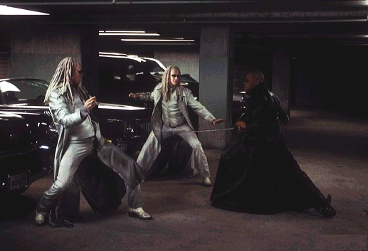 Не стоит забывать и великолепный известнейший блокбастер "Матрица". Во 2-й части 2 бледных брата-близнеца-привидения неплохо (пытались) орудовать опасными бритвами.