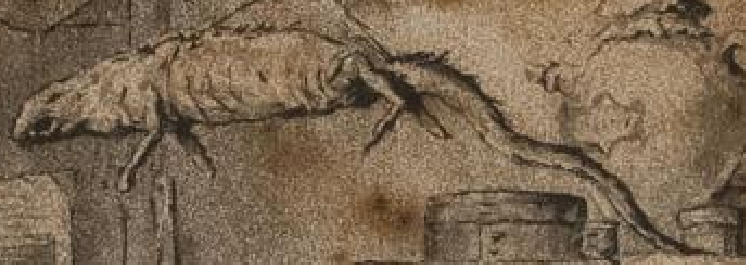 Между 1501 и 1525 годами Au centre une boutique de barbier. Son enseigne est formée de quatres bassins. Bien en vue des chalands, il rase un client В центре парикмахерская. Его знак состоит из четырех бассейнов(?). На виду у клиентов он бреет клиента Переводчик перевёл как "бассейны" Мне кажется что это плетёные шляпы... А справа вроде мужик сечками торгует, три кулька лежат... Подсказывают, что это пакикмахерские тазы.