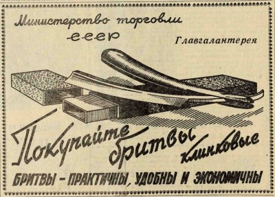На этот раз Артель "Бритва" N9, 1952 год. (До этого были известны N5 и N7) (бритву обнаружил wren, за что ему большое спасибо, что не прошел мимо раритета) Бритвы СССРчуть ли не единственная реклама опасных бритв в СССР. Без указания производителя.