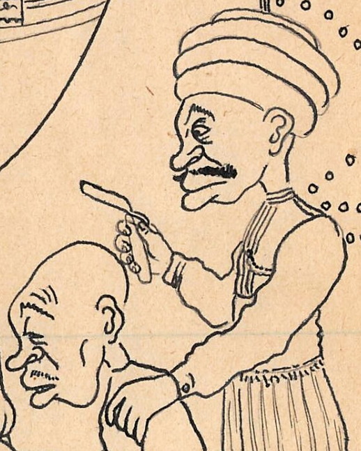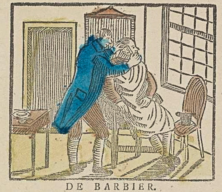 „Le barbier” „Цирюльник”, около 1920 г. Встречается и в нецветном виде: Взглянем поближе: С 2013 г. с кайфом бреюсь опасной бритвой пять раз в неделю, в три прохода.