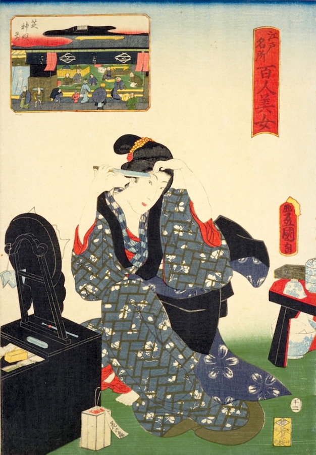 Utagawa Kunisada (Toyokuni III) (1786-1864). Утагава Кунисада, известен также как Утагава Тоёкуни III - крупнейший японский художник и мастер цветной графики периода Эдо. „Shiba Shinmei”. From the series „One Hundred Beautiful Women at Famous Sites of Edo” „Сиба Синмей”. Из серии „Сто красивых женщин в известных местах Эдо”, 1858 г. (Сиба Синмей сбривает брови) Взглянем поближе: С 2013 г. с кайфом бреюсь опасной бритвой пять раз в неделю, в три прохода.
