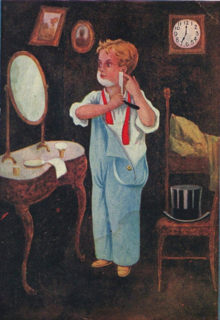 „Young Boy Shaving” „Мальчик бреется” Взглянем поближе: С 2013 г. с кайфом бреюсь опасной бритвой пять раз в неделю, в три прохода.