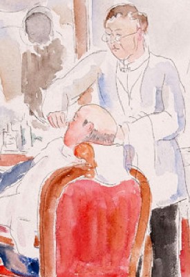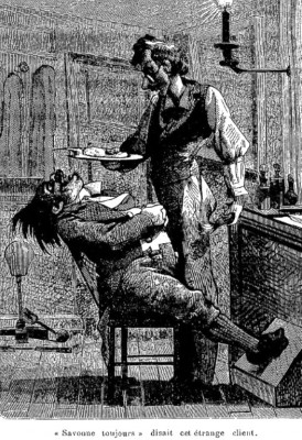 „Le barbier de Nuremberg” „Нюрнбергский цирюльник” Надпись внизу: „Savonne toujours disait cet etrange client (Мыло всегда воздействовало этому странному клиенту)”. Бритва справа: С 2013 г. с кайфом бреюсь опасной бритвой пять раз в неделю, в три прохода.