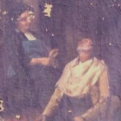 „La Barbiеre bretonne” „Бретонский цирюльник”, ок. 1883 г. Кажется, это женщина-цирюльник и править бритву на ладони, но к сожалению, картина в плохом сохране. Взглянем поближе: