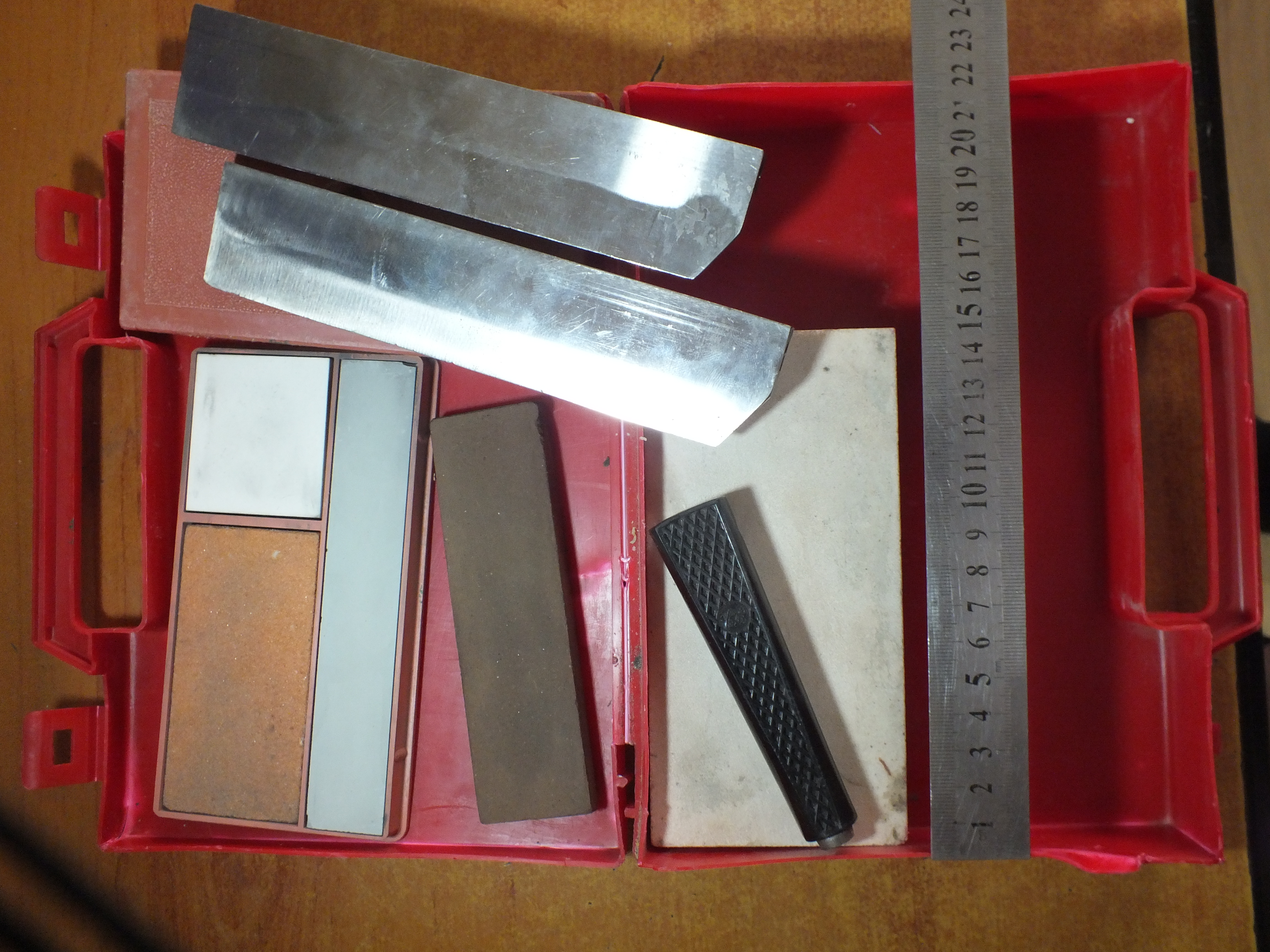 Ножи 180х40х10, бруски для доводки в коробочке #400, #3000, #8000 Плюс два бруска левых. Белый А25 #800 (150х75х25мм) и микрокорунд около #1000 (150х35х10 мм.) Взял из за большого А25. Размер бритвенный. У скошенного края ножей отверсие с резьбой М5 Из одного сделаю дебу. Ну или подобие дебы 32 года активно мусолю харю клинковой бритвой