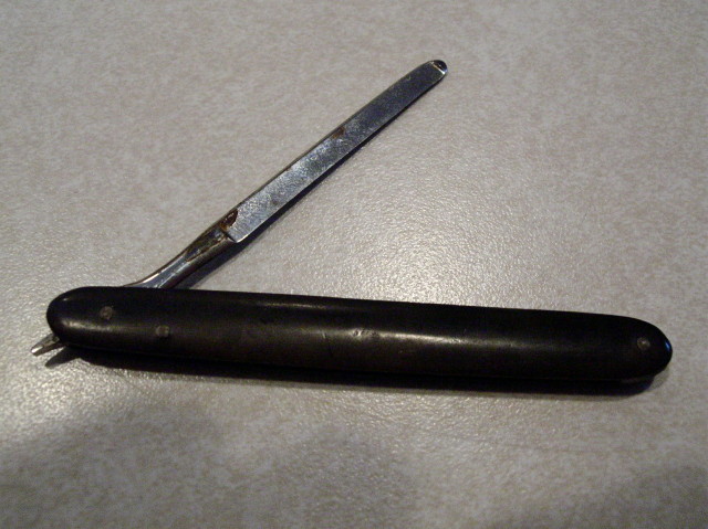 Up for auction is this vintage small straight edge. There us a small makers mark on the blade, but I cannot read it. The handle is plastic of some sort. Total length opened is 5 1/2", blade length is 2 1/4" and the handle length is 3 1/4". The blade is 3/16" wide. Excellent vintage condition. Email with questions. Thank you for your interest.
