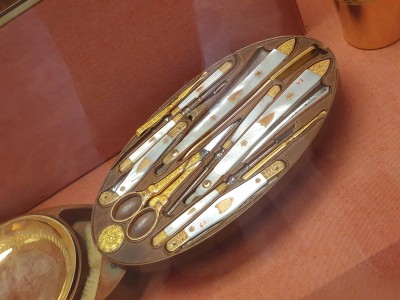 Забавно, что этот дорожный набор я сфотографировал будучи в Эрмитаже буквально неделю назад. Но он стоял в отдельной витрине вообще без этикетки с атрибуцией. Рядом экспонаты с подписями, а этот нет. Возможно когда доставали для съемки из витрины забыли картонку с описанием поставить на место.