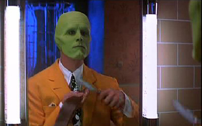 Разбирая свою видеотеку случайно наткнулся на сборник фильмов, в которых играл отличный комедийный актер Джим Керри. Среди прочих на этом диске присутствовал художественный фильм 1994 года выпуска - Маска. Подумал - "а почему бы не посмотреть? классика всетаки..." И каким же было мое удивление, что персонаж Джима Керри (тот самый зелёноголовый лысый тип с широкой улыбкой) тоже пользуется опасной бритвой... Привожу несколько кадров из фильма, но прошу меня извинить - качество оставляет желать лучшего... Пиратская версия