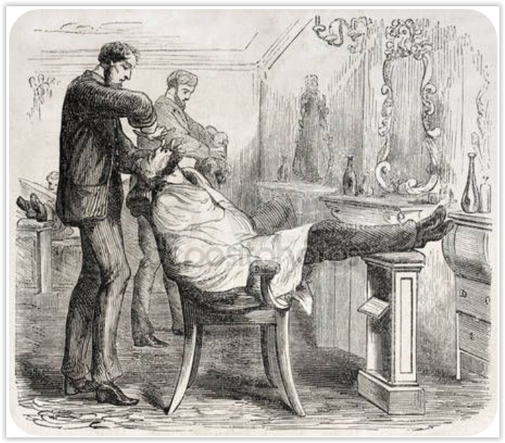 „A Barber Shop”, ”В цирюльне”, 1849 г. (цирюльник слева). „An old man in Tiflis (Tbilisi) Georgia having a shave”, Russian postcard 1928, „Бритье взрослого мужчину в Тифлисe (Тбилиси) Грузия”. Русская почтовая карточка (открытка) 1928 г.